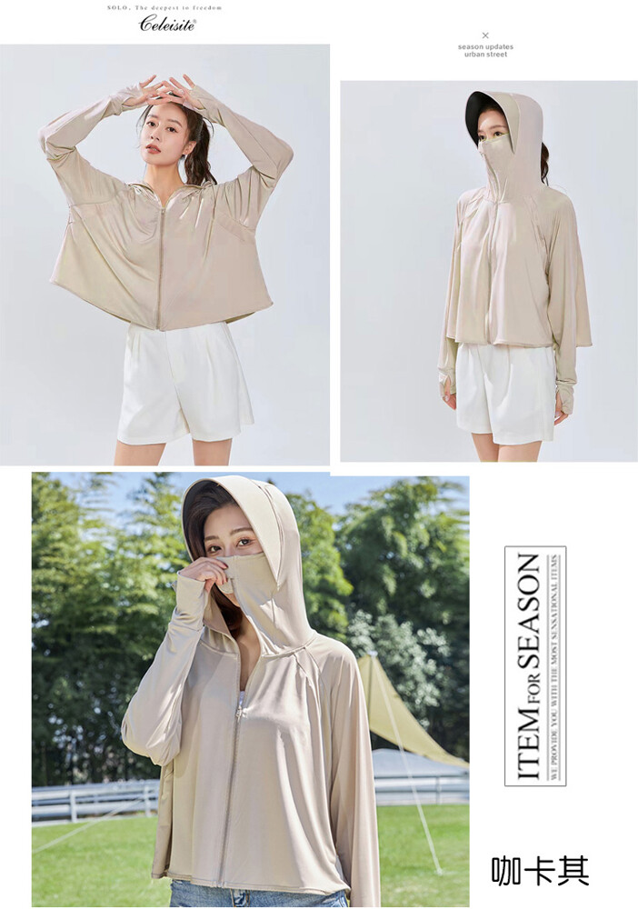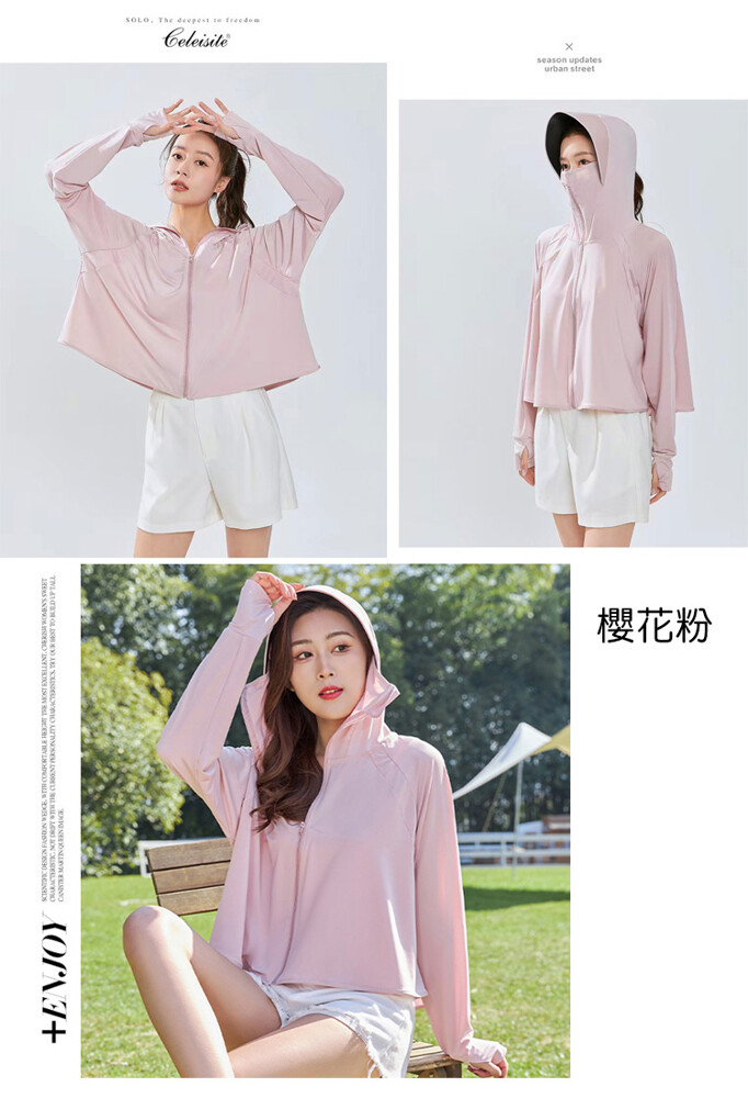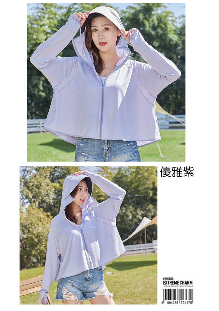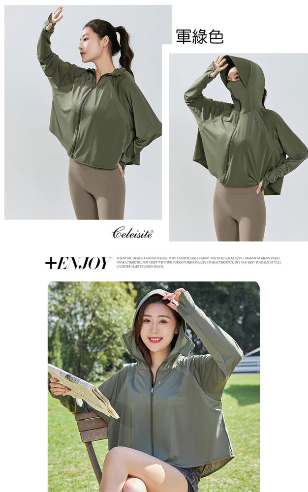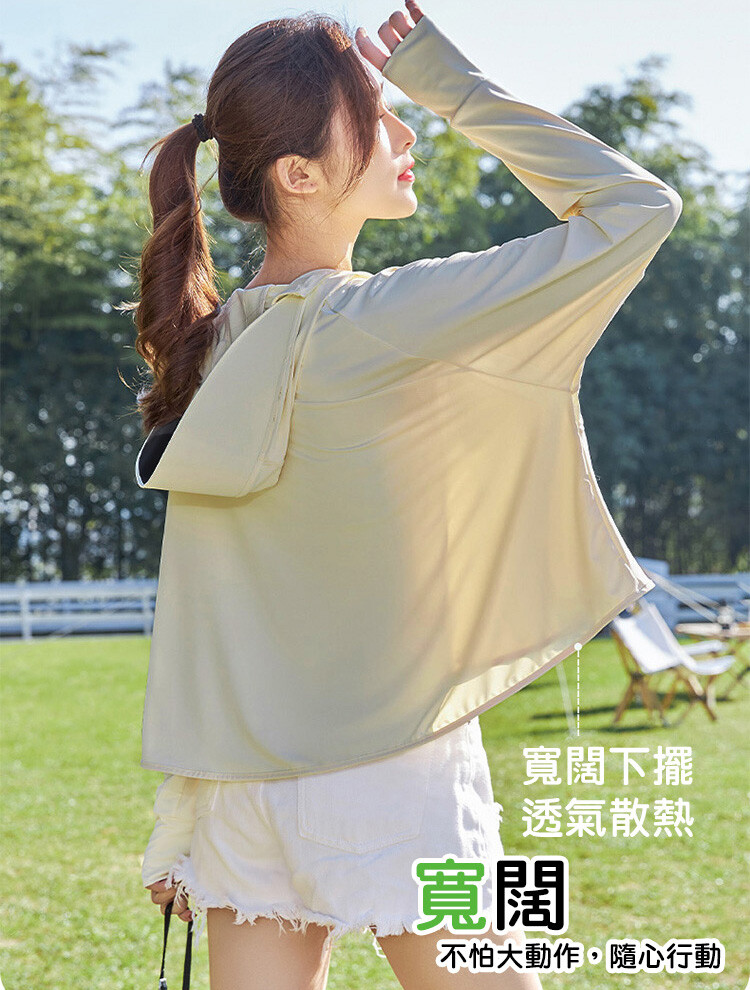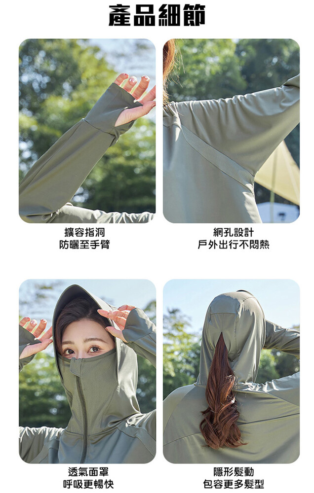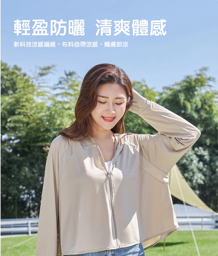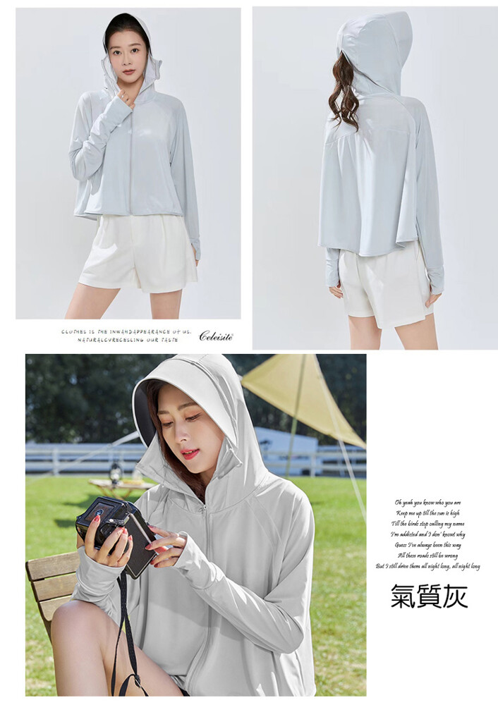 名稱:親膚冰絲輕薄不悶熱透氣黑膠帽圍防曬外套-D