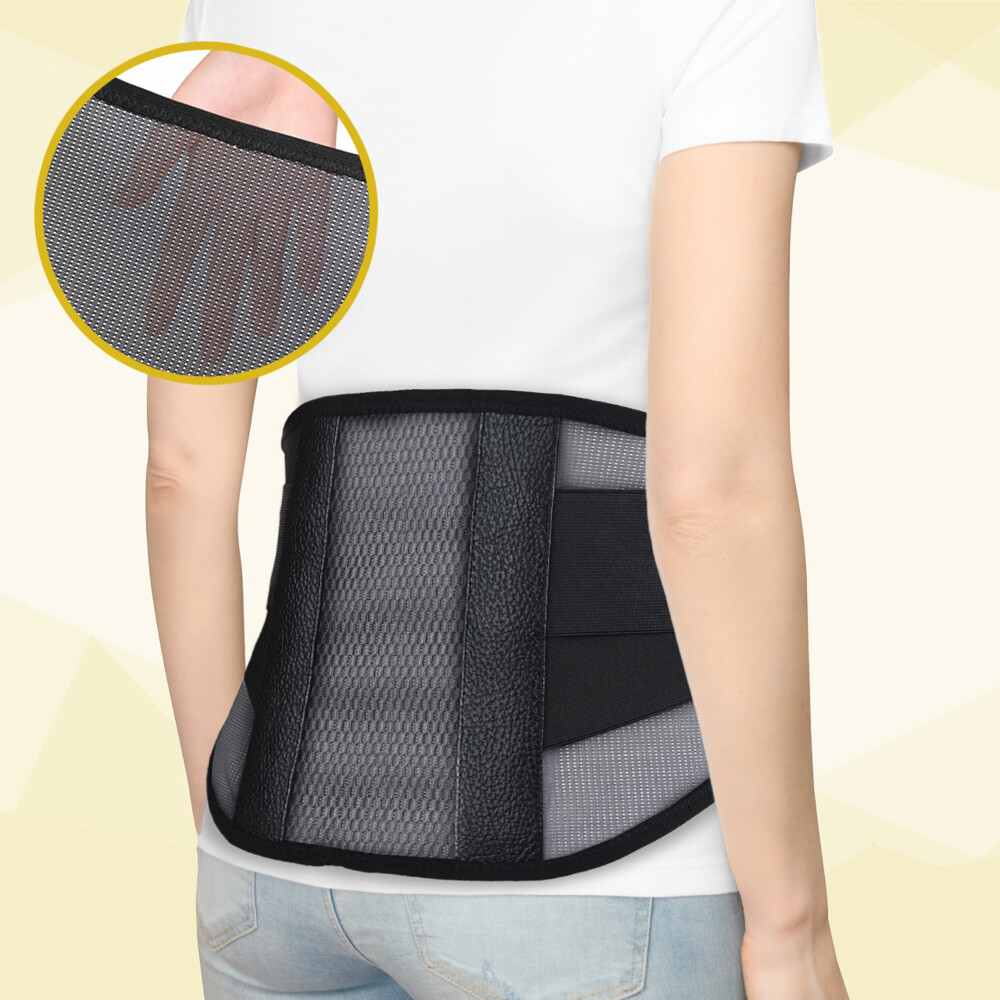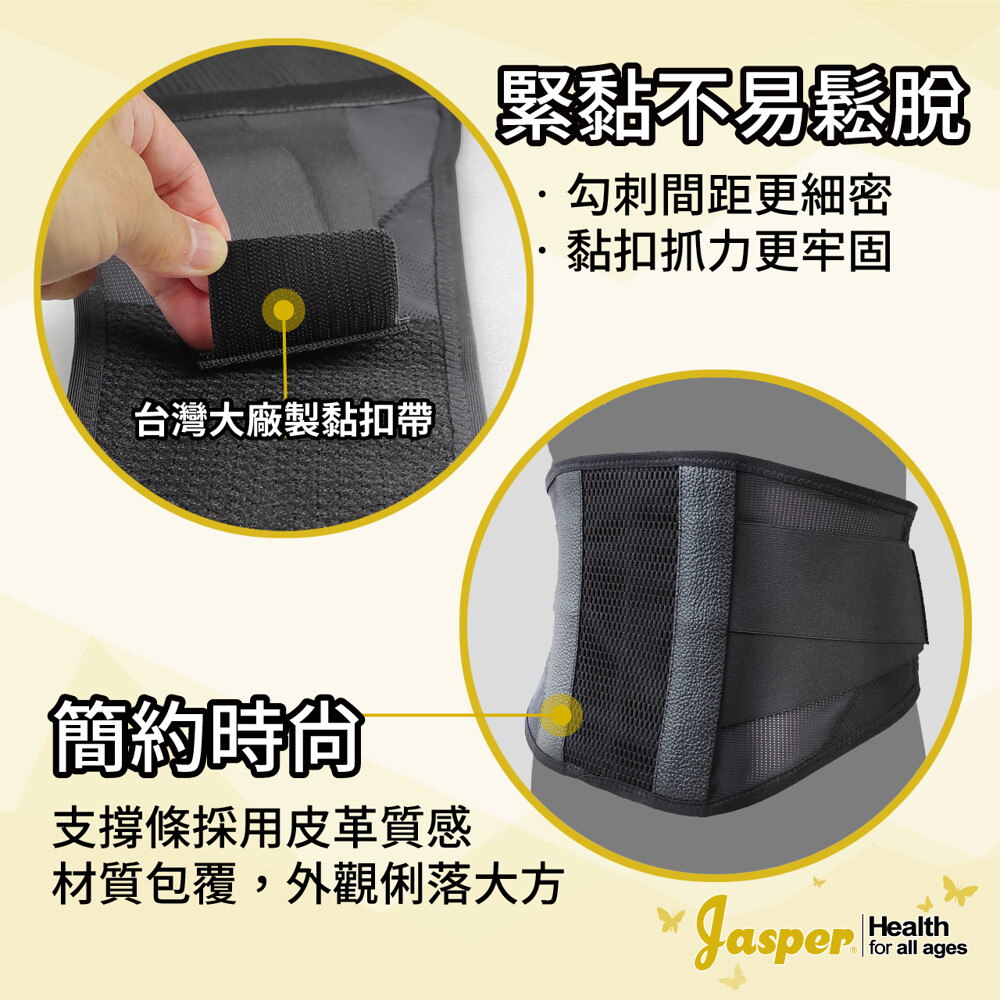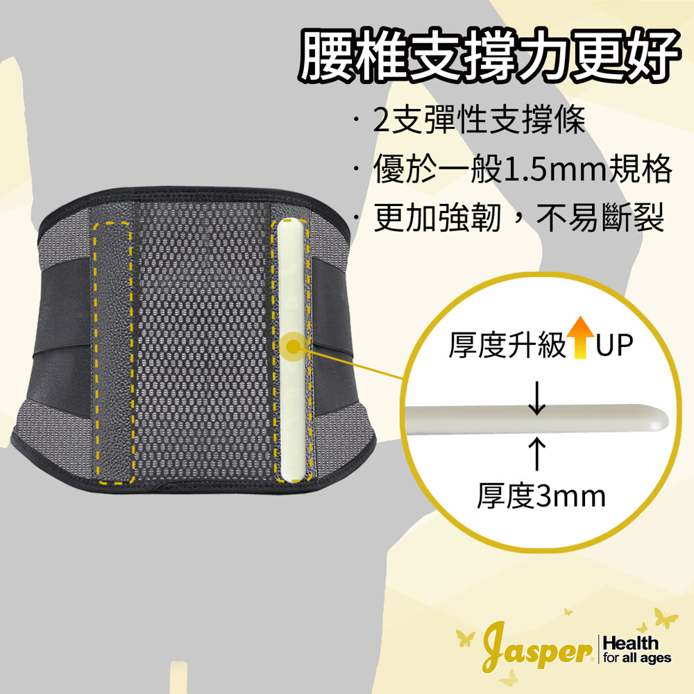 • 護腰帶後側裝有2根18.5公分塑膠支撐桿。