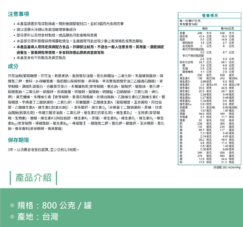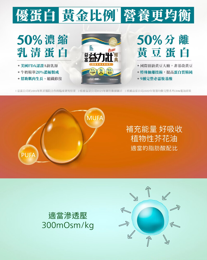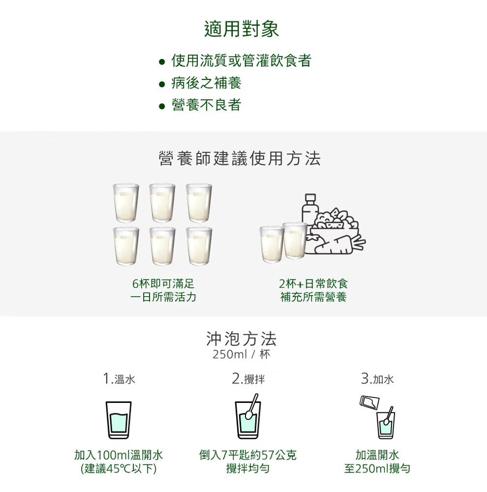 優蛋白黃金比例¹ ,營養更均衡 嚴選高品質濃縮乳清蛋白及分離黃豆蛋白 蛋白質熱量佔比16.8%,提供完整必需胺基酸 油脂來源為富含單元不飽和脂肪酸的芥花油 未添加動物性油脂,奶素可食 口飲/管灌皆適用,調整體質,改善營養狀態