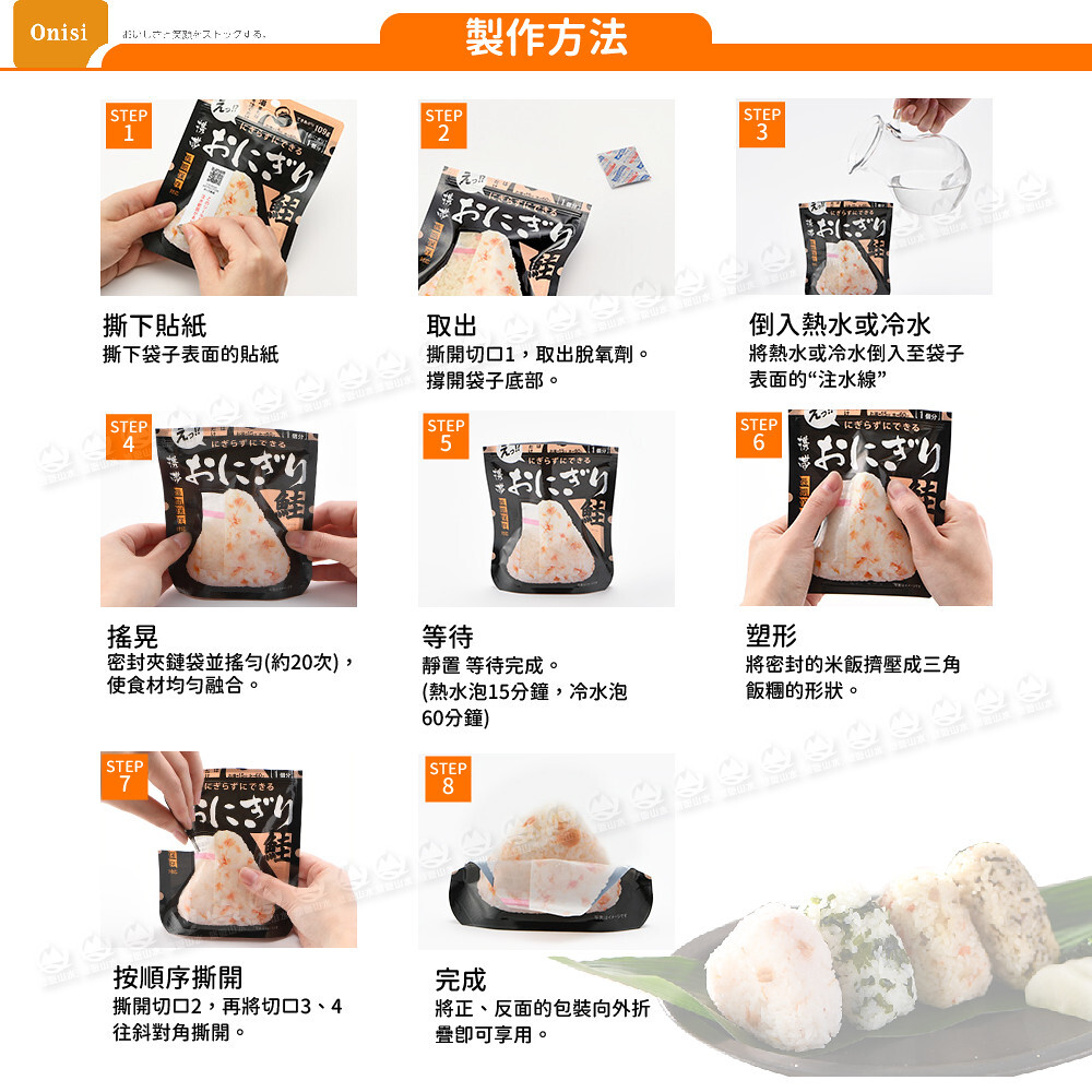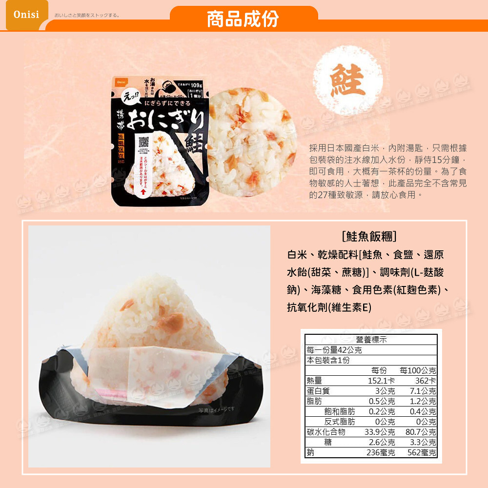 成份:米(日本)、調味乾料(鮭魚、食鹽、還原糖漿)/調味料(氨基酸)、海藻糖、紅米曲色素、抗氧化劑(維生素E)、(部分含有鮭魚)