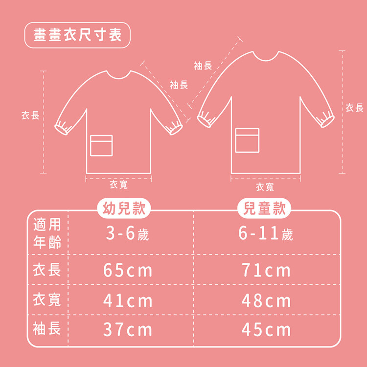 此款畫畫衣適合繪畫教學和烹飪教學,也可用於藝術課程、萬聖節服裝、戲劇道具、生日派對和主題派對裝飾的可愛活動。是用餐、畫畫、美勞等活動的好選擇。