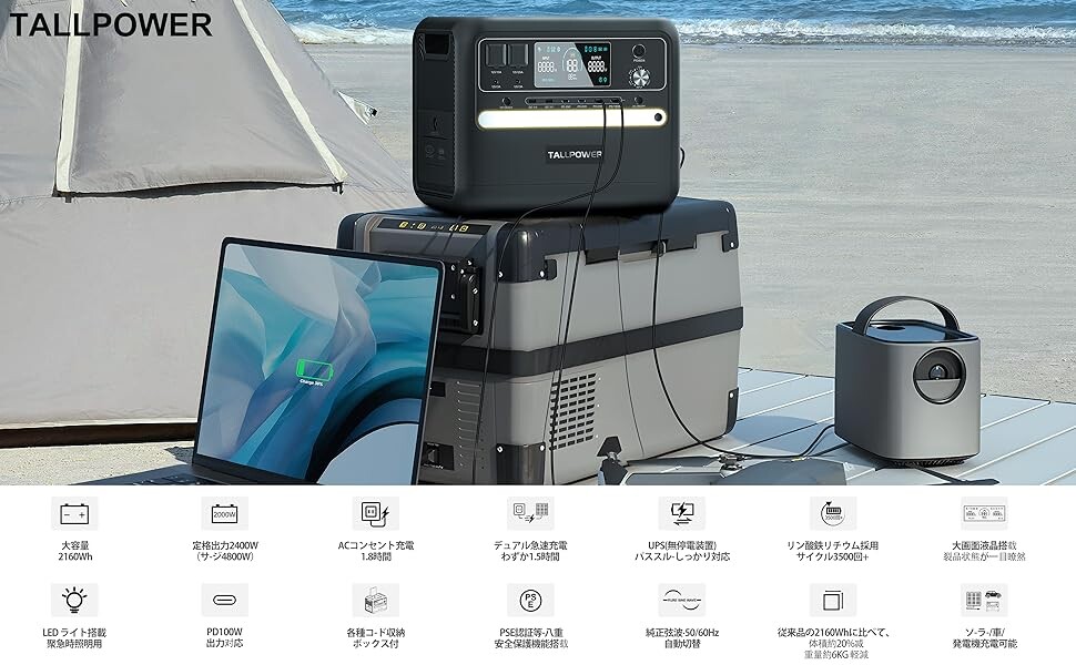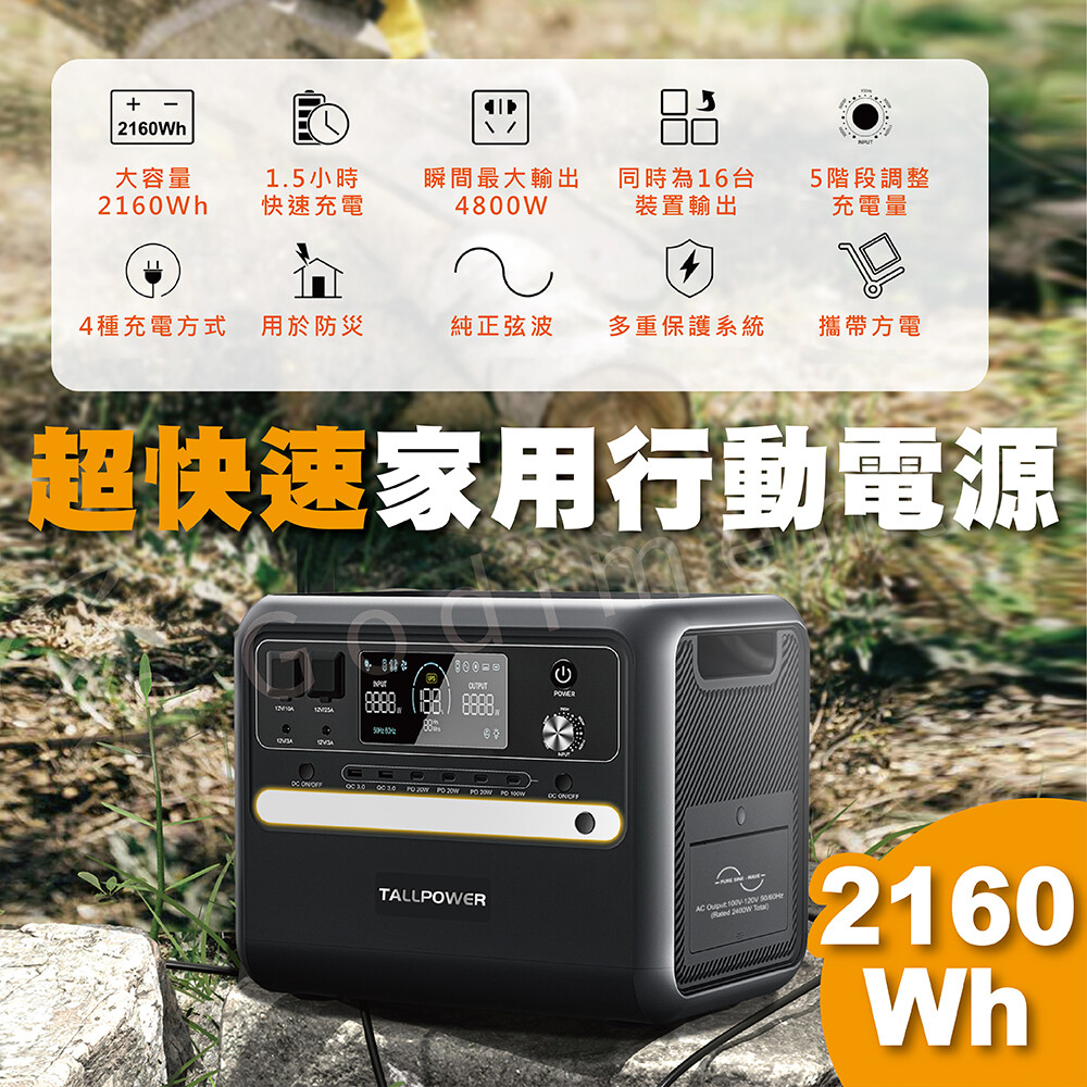 搭載 2160Wh 超大容量鋰電池,適用於戶外露營、家庭備用電源、房車旅行等多種場景,確保您的設備在任何時候都能獲得穩定電力,無需擔心電量不足!