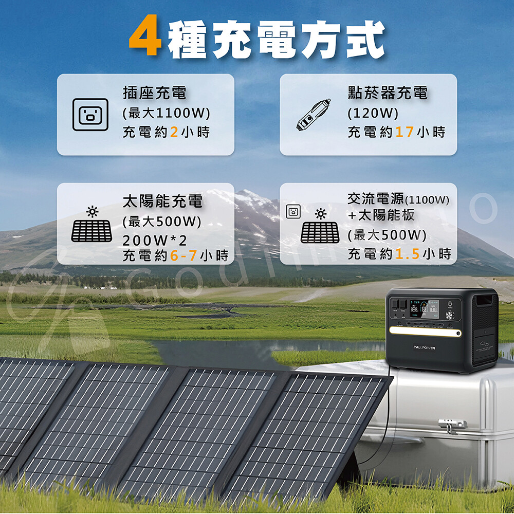 交流充電 + 太陽能 500W 輸入:1.5 小時