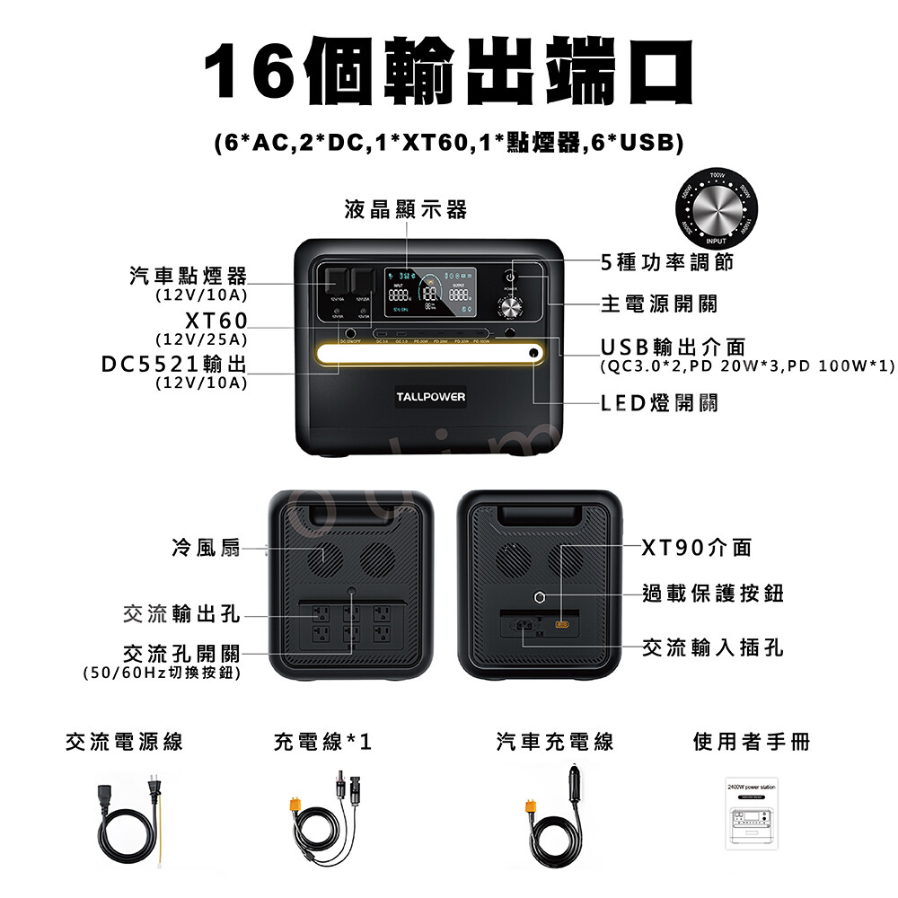 ✔ 4 個 AC 插座(2400W 純正弦波輸出)— 適用於家電、筆電、電動工具等