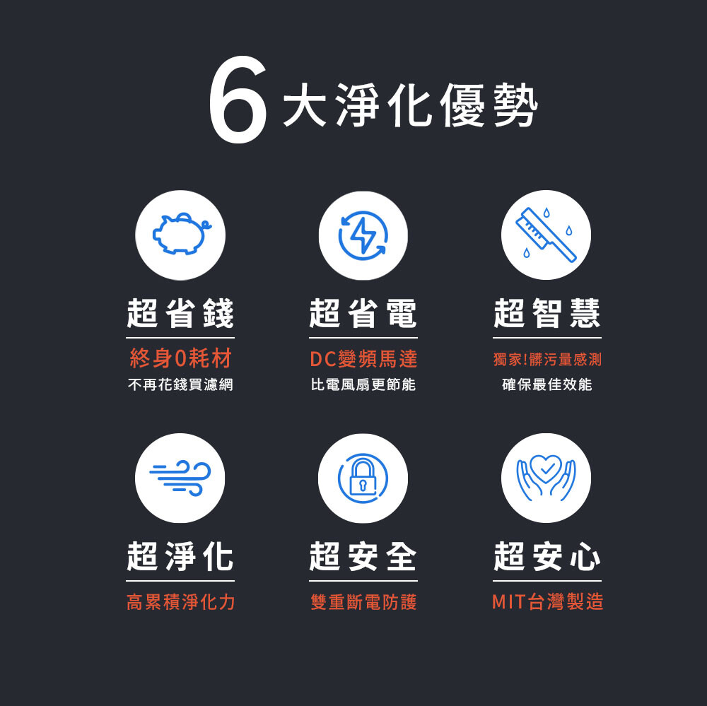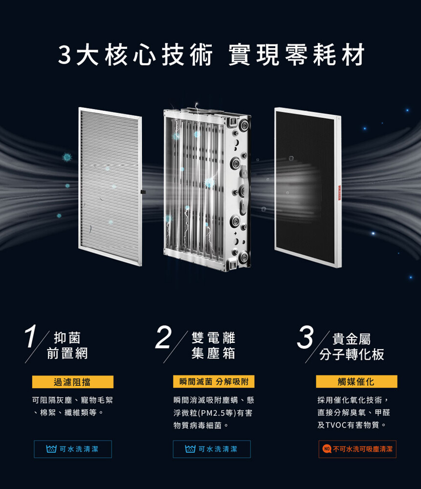 大風量600CMH能迅速淨化大空間,獨家電離滅菌技術不僅有效去除各種有害微粒,還能高效去除焦油或油煙,不僅不會影響淨化效能,也不會堵塞淨化通道,只需水洗即可重複使用,既節省了濾網耗材費用又環保。