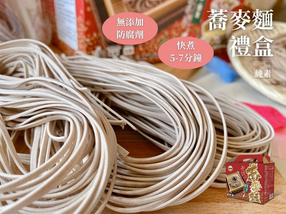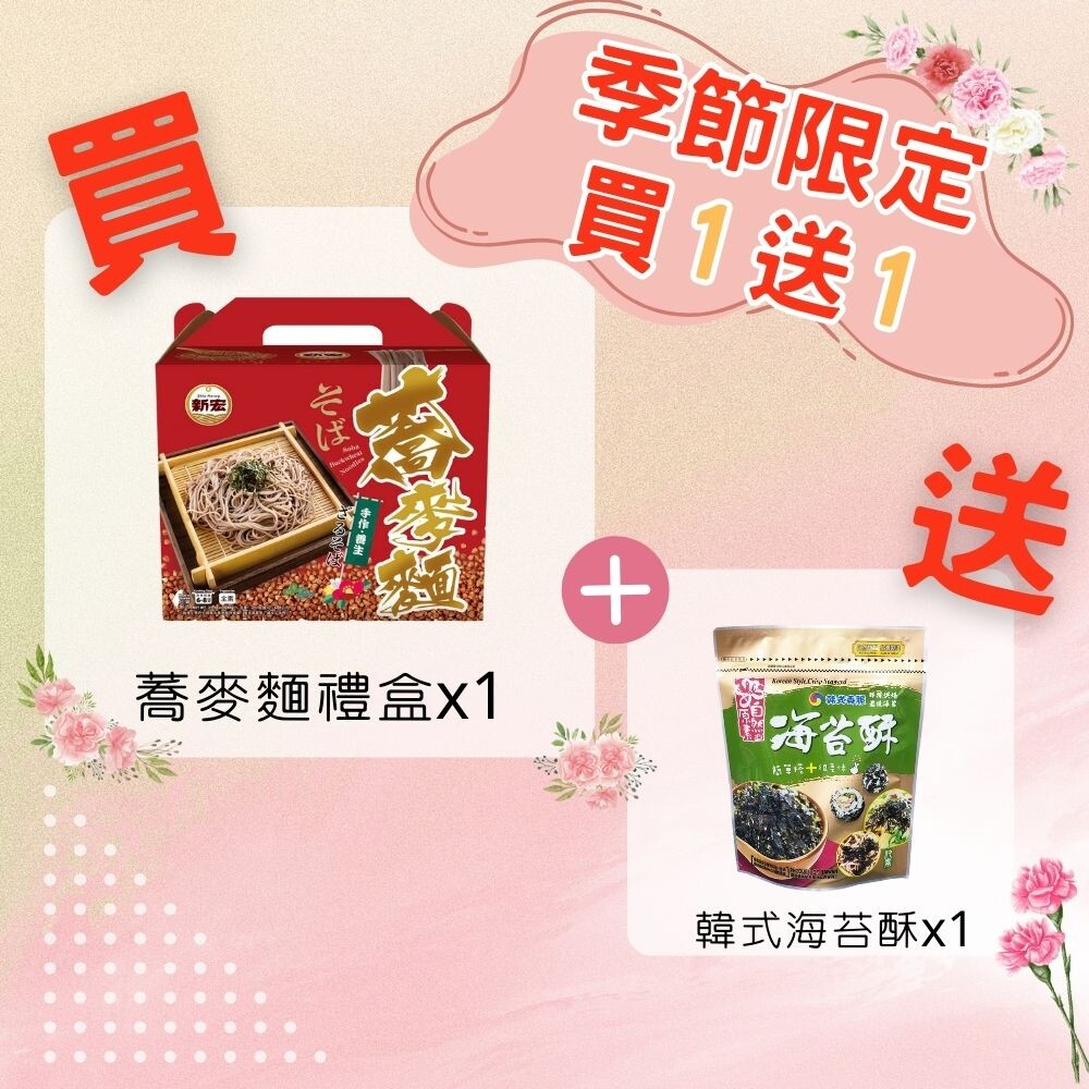 搭配傳承一甲子的製麵經驗 獨家工法製作 特製粉心粉與蕎麥粉的 完美融合比例 多道壓延 耗時工法 造就經典麵食 內含三份獨立包裝蕎麥麵 送禮自用絕不馬虎 【優惠組】蕎麥麵禮盒(全素)600G×1盒送1包 蕎麥麵禮盒×1盒 送 韓式海苔酥30G*1 (全素)