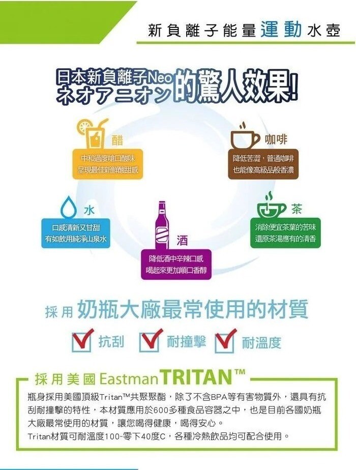 ◆ 瓶身材質:瓶身採用美國伊士曼Eastman Tritan™新一代共聚聚酯材質