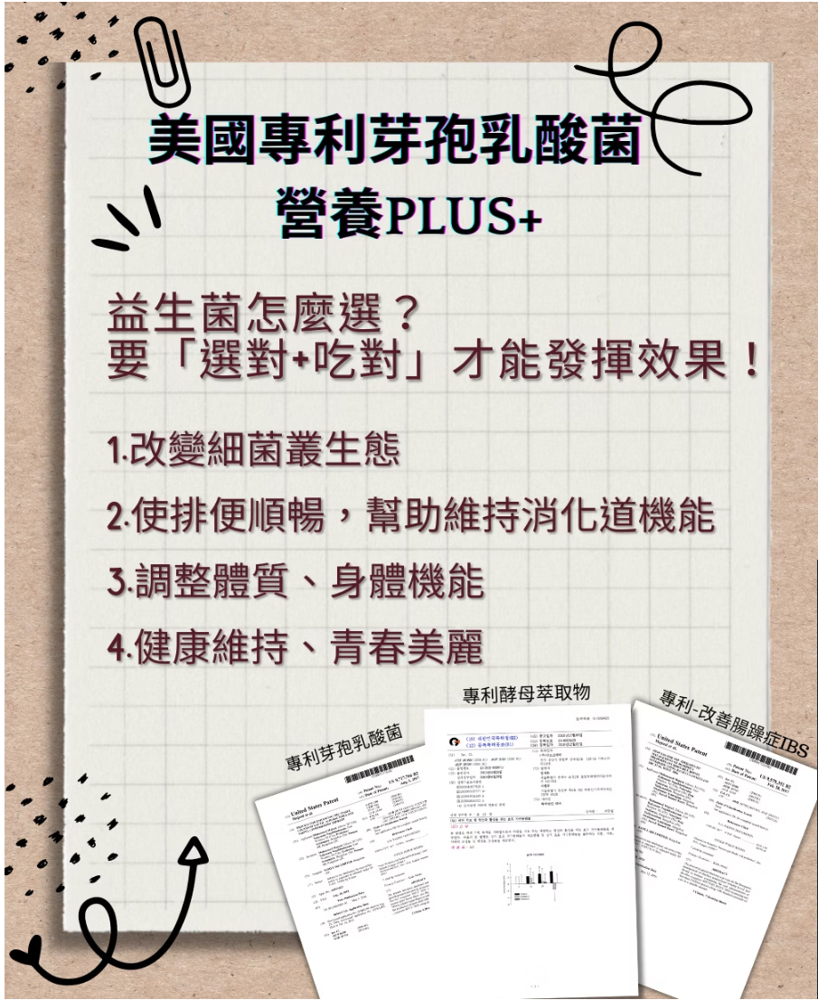加入美國專利芽孢乳酸菌成份,幫助維持消化道機能,排便順暢PLUS+