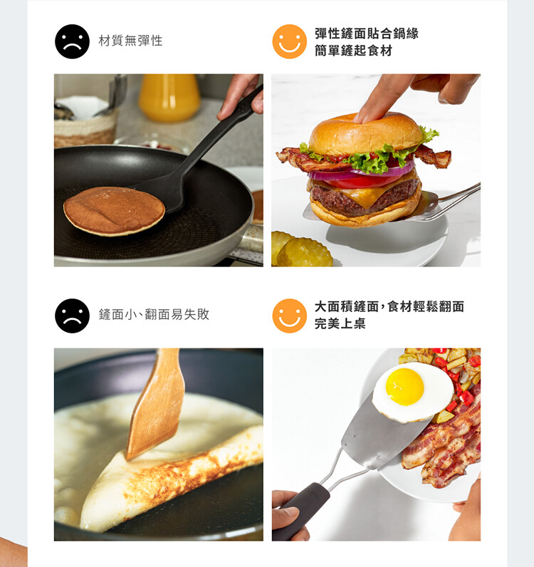 彈性不鏽鋼鏟面易於盛裝各類食材