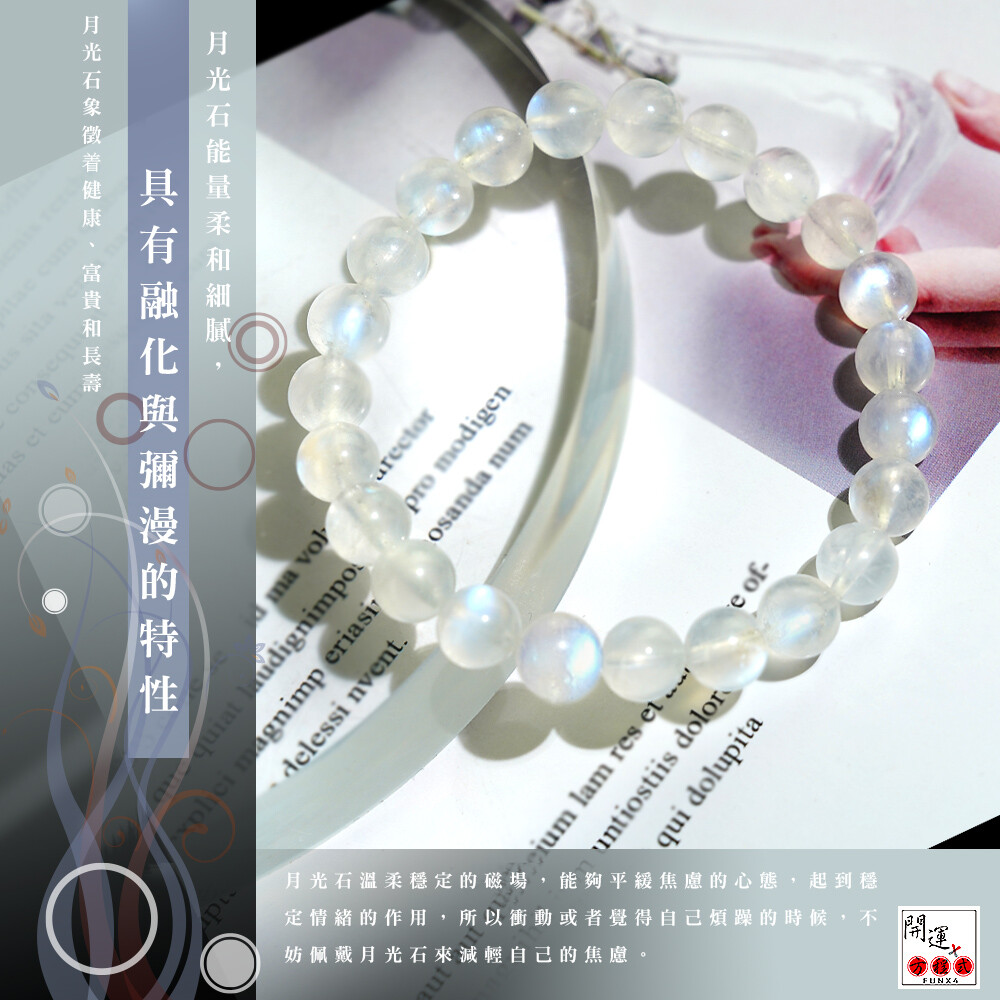 「平衡女性內分泌系統」它能幫助女性內分泌系統平衡,有辦公室的夥伴們實驗,經常配戴月光石,當月的生理期會很順暢,幾乎都不會有不適感了。另外也有肋眠、思維變得清新,幫助腦部的思考的效果,長期佩戴月光石有幫助保持愉快的心情,也可以改善氣質,更會護膚、明眸、護髮。