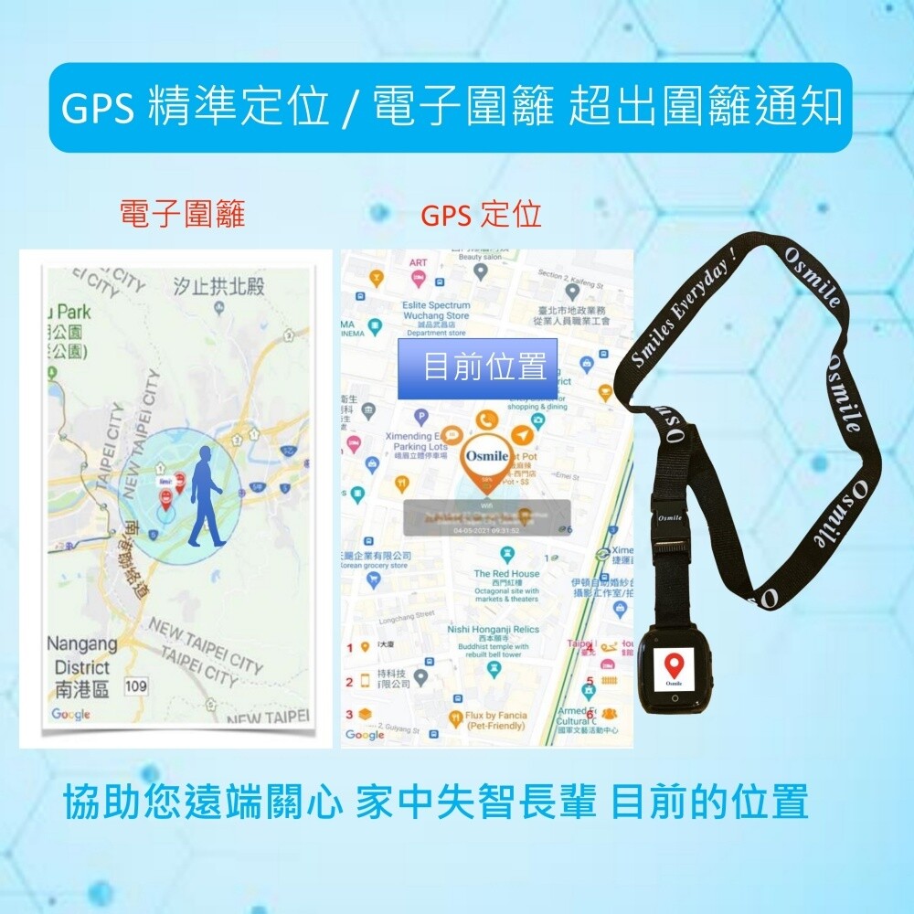 Osmile GPS1000 個人衛星定位器為協尋輔具,長者安全最主要還是需要家人負責與關心。另外 Osmile GPS1000 為充電使用裝置, 及透過4G/5G 訊號通訊, 使用者忘記充電或電信公司4G/5G 訊號無法涵蓋的範圍,都有可能造成手錶無法發揮求救通話/定位/跌倒求救的功能, 以上因素為 Osmile 公司無法掌控的風險與因素。因此Osmile 公司不負責任何穿戴Osmile GPS1000 銀髮長者走失, 跌倒或安全的相關法律責任。