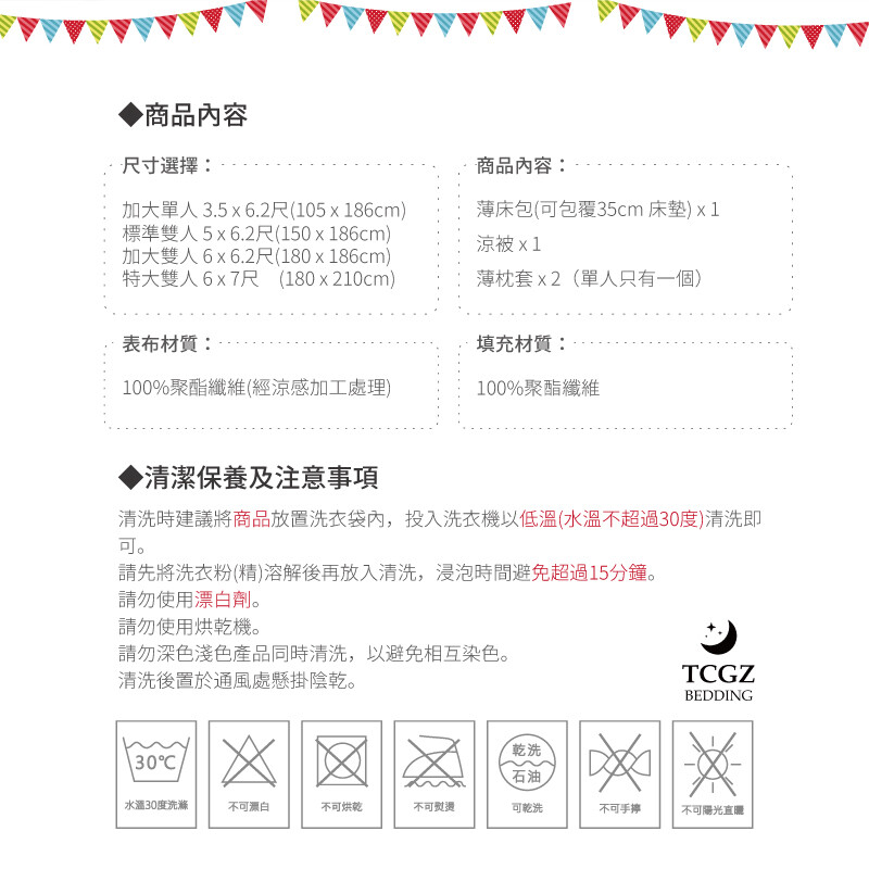 加大單人:薄床包 x 1 、涼被 x 1 、薄枕套 x 1
