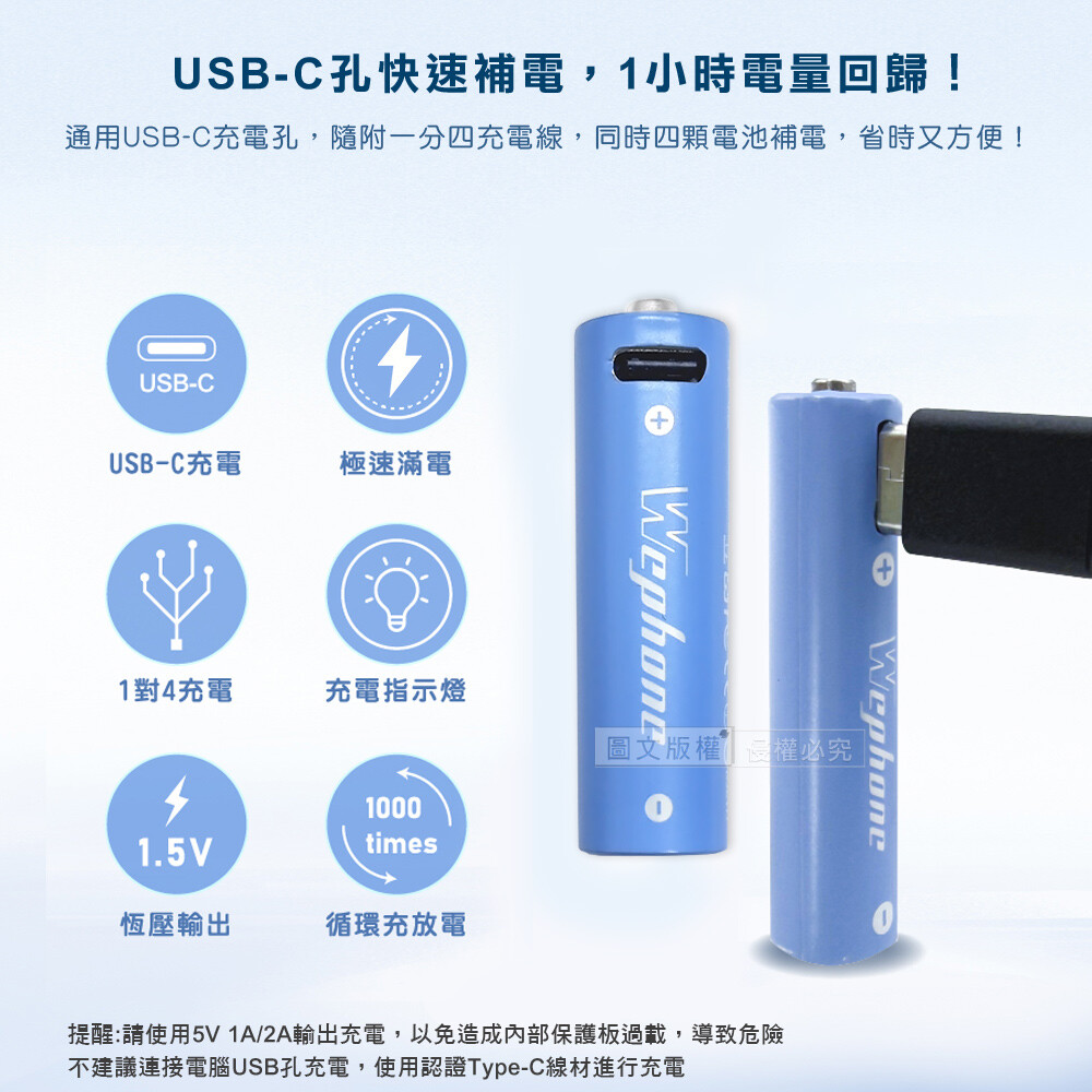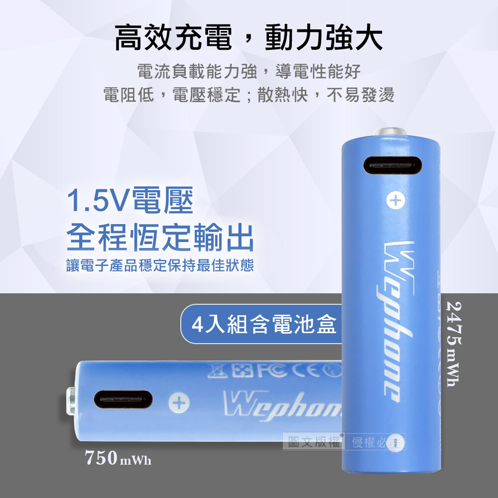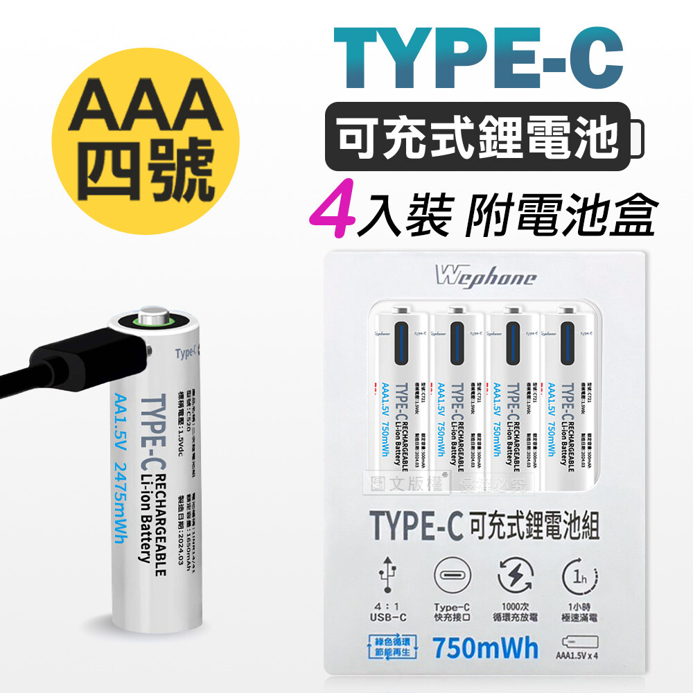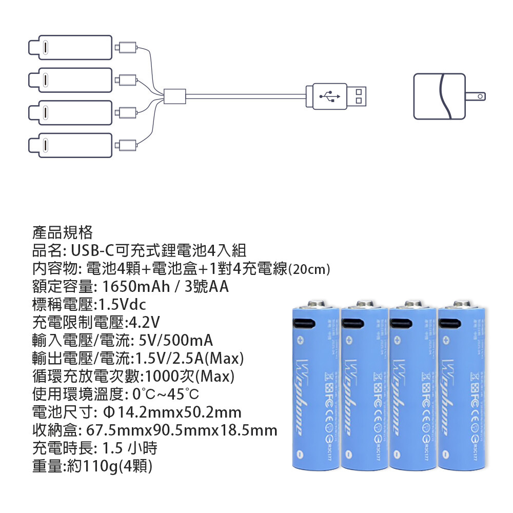 內容:可充式鋰離子電池4入裝*1、1對4Type-C充電線(20cm)*1、電池收納盒*1