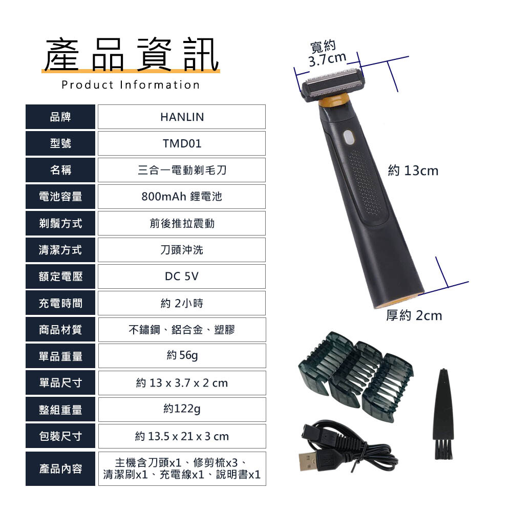 產品內容 : 主機含刀頭x1、修剪梳x3、清潔刷x1、充電線x1、說明書x1
