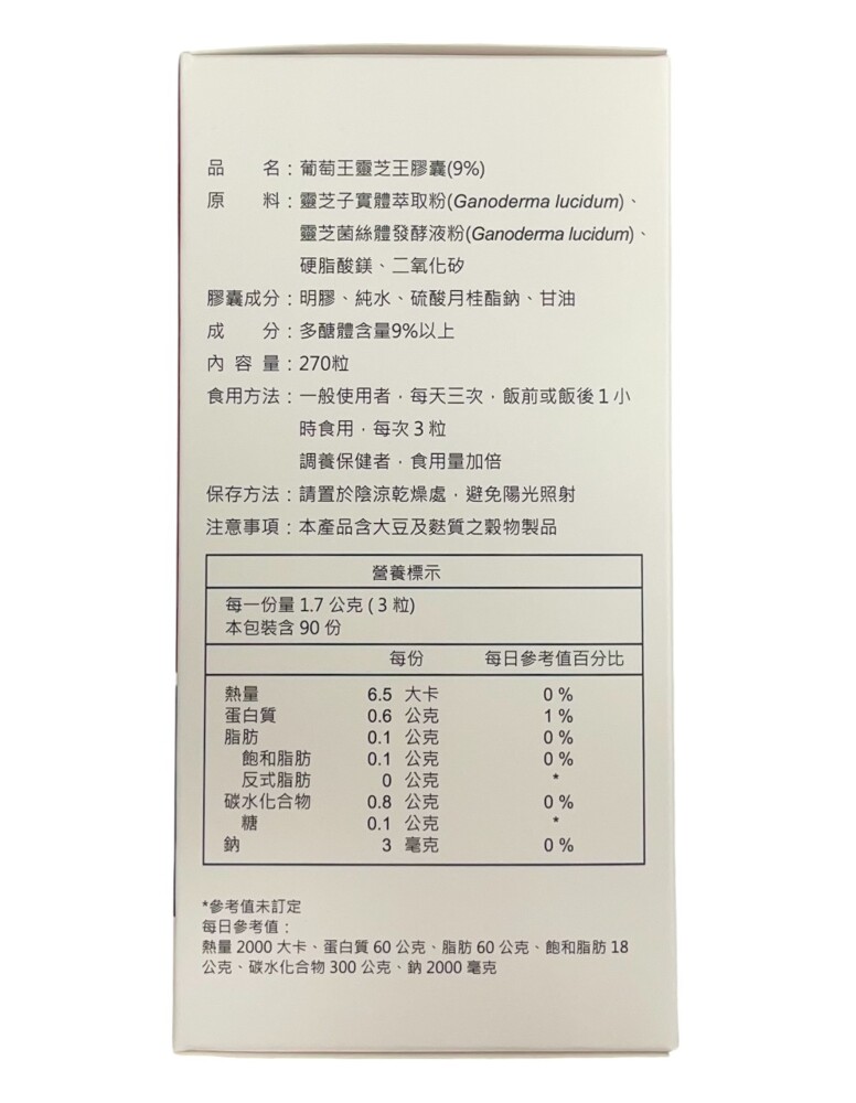 *成分:靈芝子實體萃取粉(Ganoderma lucidum)、靈芝菌絲體發酵液粉(Ganoderma lucidum)、硬脂酸鎂、二氧化矽