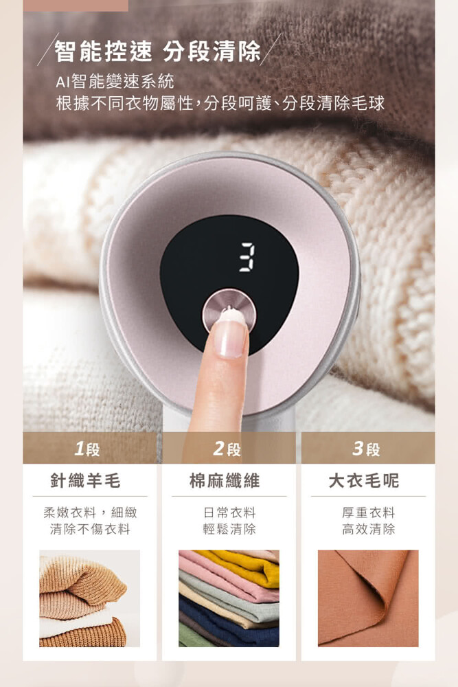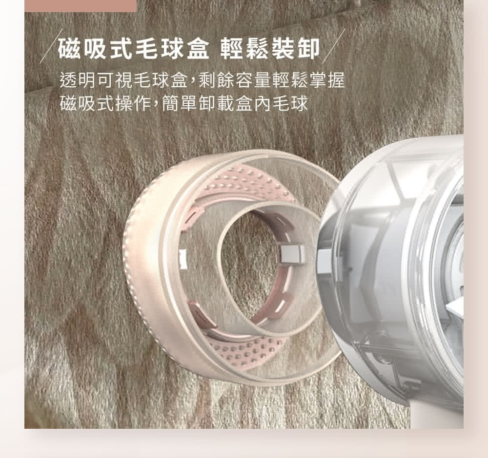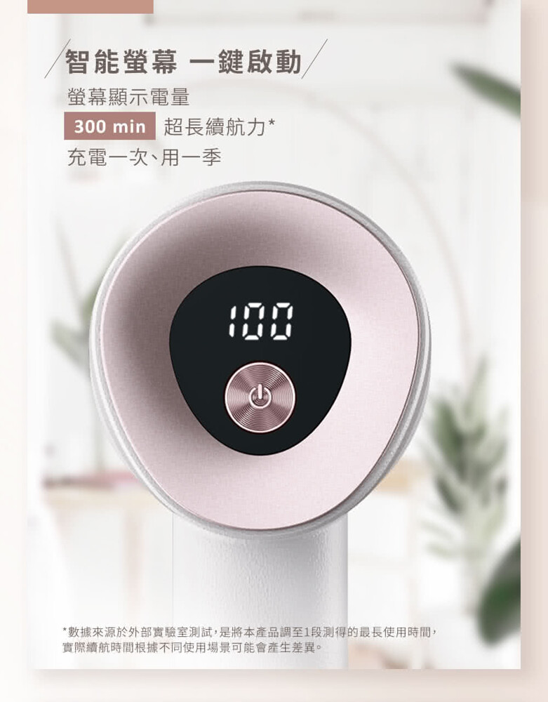 衣美機智能螢幕一鍵啟動,超長續航力300分鐘,充電一次可用一季,螢幕顯示電量一目瞭然,磁吸式毛球盒設計,輕鬆裝卸方便清潔。