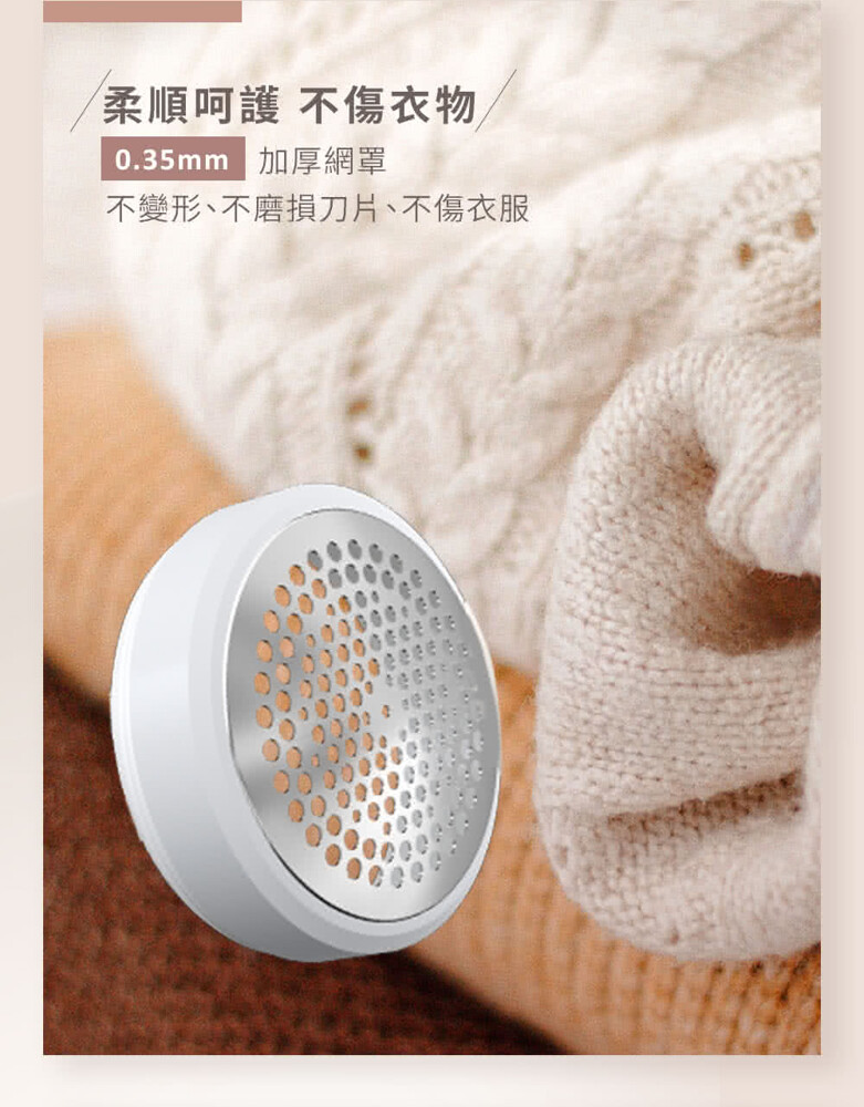 搭配0.35mm加厚衣物網罩,不變形、不磨損刀片、柔順呵護不傷衣料,適用各種材質衣物,徹底清除惱人毛球。