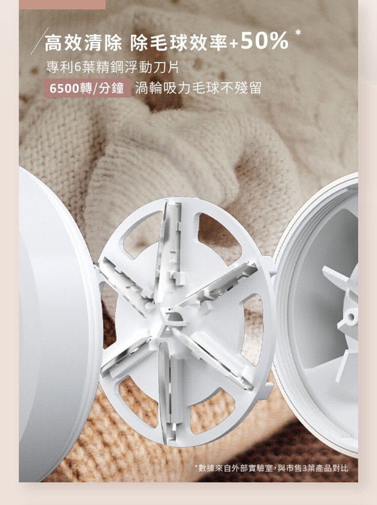 擁有專利6葉精鋼浮動刀片,每分鐘高達6500轉,除毛球效率提升50%,擁有渦輪吸力及防回流雙風道,俐落修剪毛球,大力吸入不殘留。
