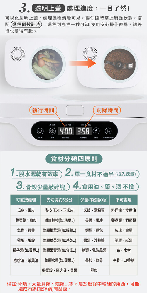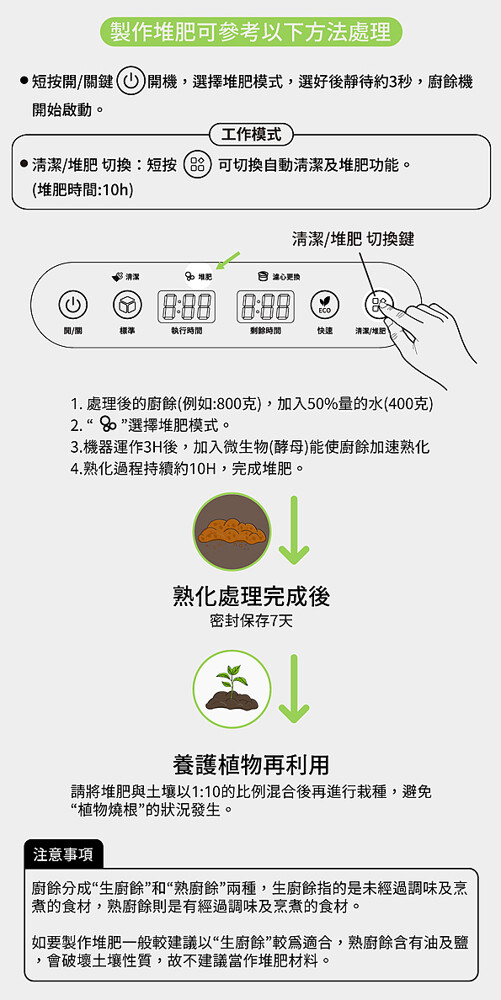 運作時間:標準模式4,5,6小時 快速模式1,2,3小時 清潔時間30分鐘 推肥時間10小時