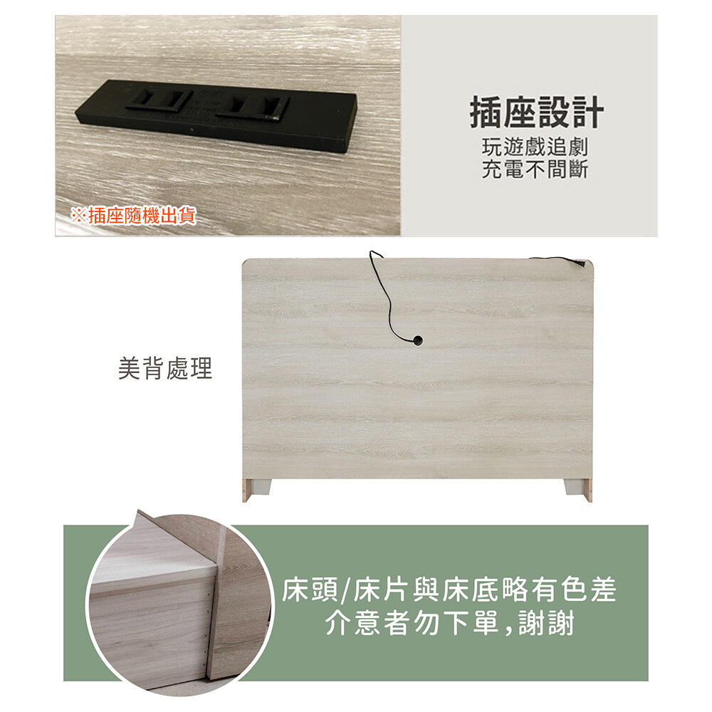 此頁販售為「房間組二件(插座床片+3分床底)」購買時請注意 附插座,使用便利 搭配三分床底,經濟簡約 邊角圓弧處理,安全不刮手 免組裝送到家 ※ 勞務費資訊請詳閱商品圖片說明 ※ ※ 本商品為大型家具,不適用免運活動 ※