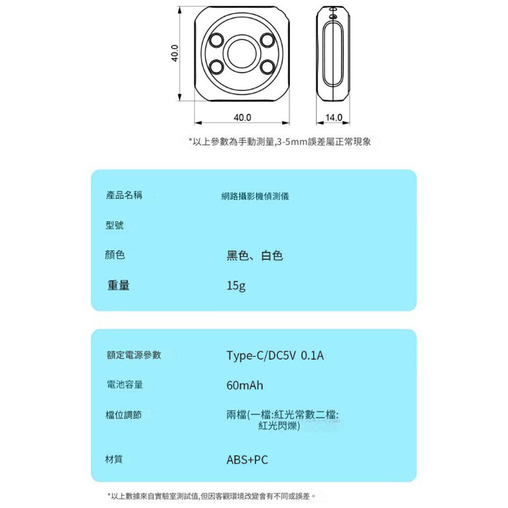黑色 白色 產品名稱:攝影機偵測儀 顏色:黑色、白色 重量:15克 額定電源參數:Type-C/DC5V 0.1A 電池容量:60毫安培時 檔位調整:兩檔(一檔:紅光常數、 二檔:紅光閃爍) 材質:ABS+PC