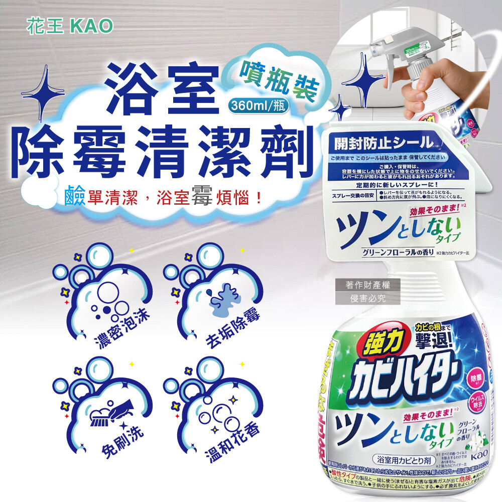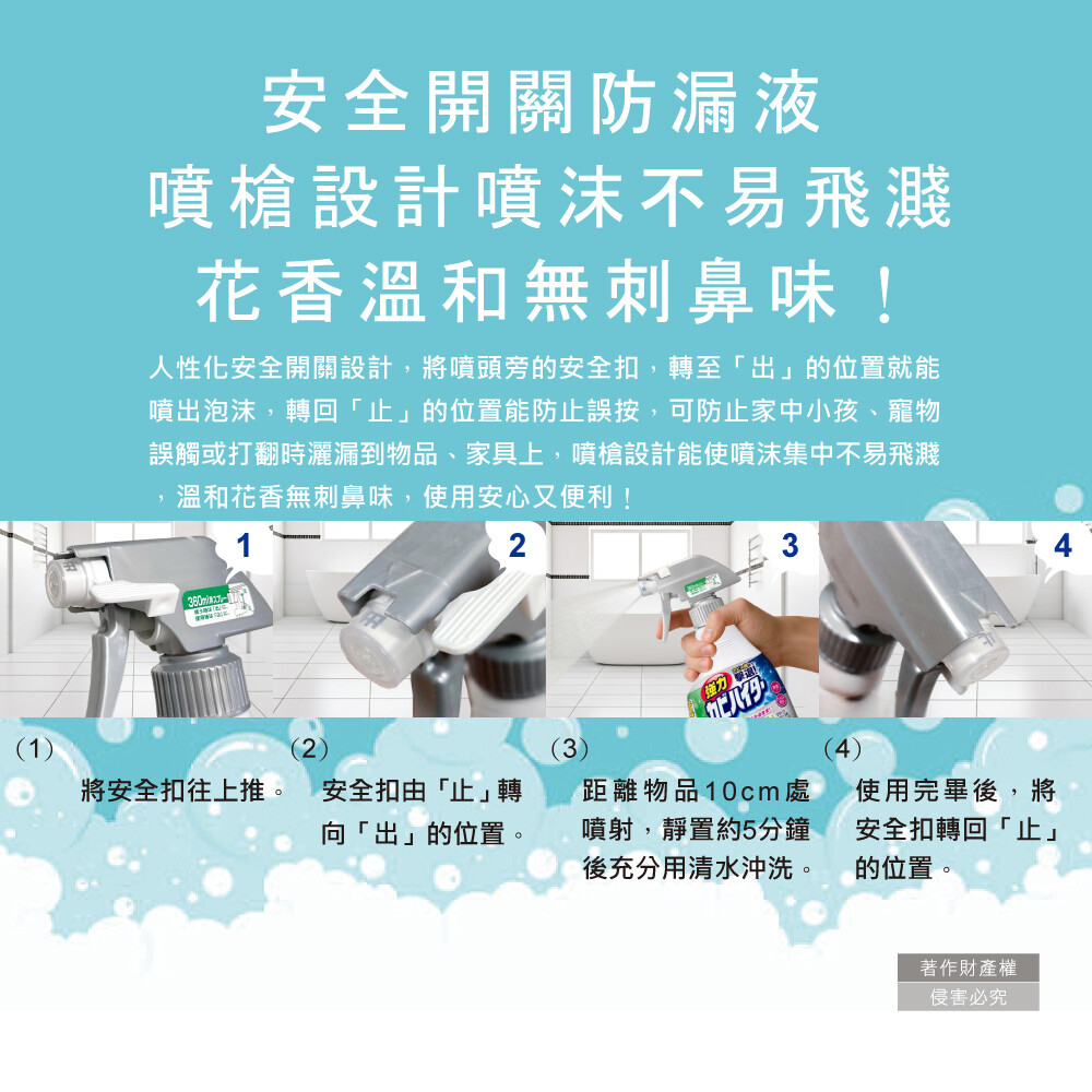 ●噴沫集中少飛濺,花香溫和無刺鼻味,免刷洗約5分鐘,輕鬆潔白浴室!