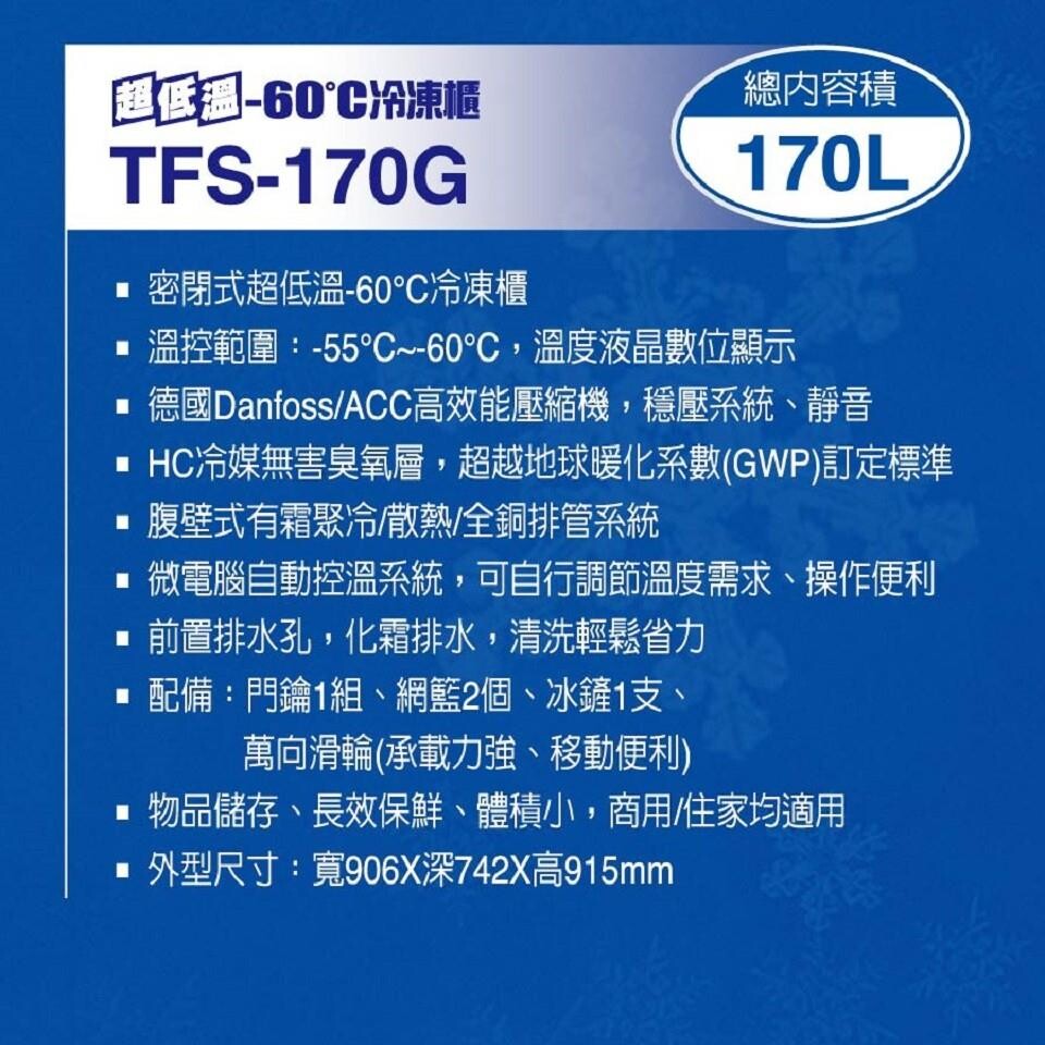 【SANLUX台灣三洋】170公升 -60度超低溫冷凍櫃 (TFS-170G) ◆含基本安裝/運送◆