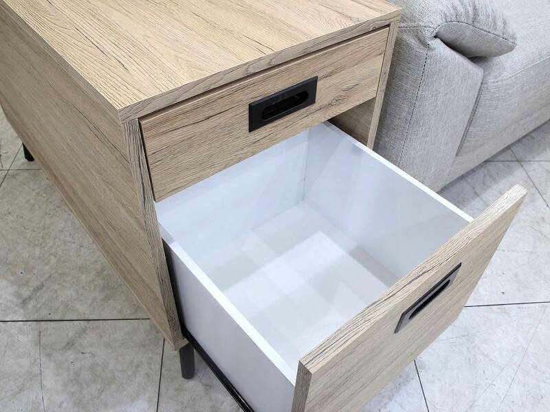 | 材質 | 板材 : 桌面板,桶身,門板皆為木心板材 塗裝 : 仿古梧桐色耐磨木皮,前緣彎角圓弧處理 五金 : 內建二抽採鋼珠滑軌,黑鐵把手, 後緣面紙盒收納空間,上掀門緩衝後 鈕,12cm高黑鐵腳座 |