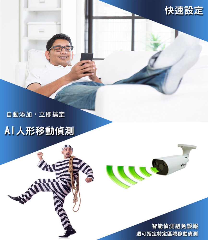※AI人形辨識,警報可顯示〝人形移動〞或〝畫面移動〞方便您快速判斷;
