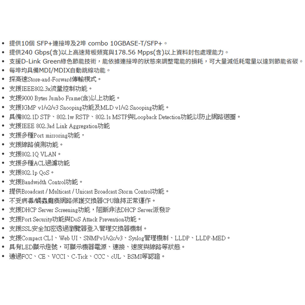 -Compact CLI、Web UI、SNMPv1/v2c/v3、Syslog管理機制、LLDP、LLDP-MED。