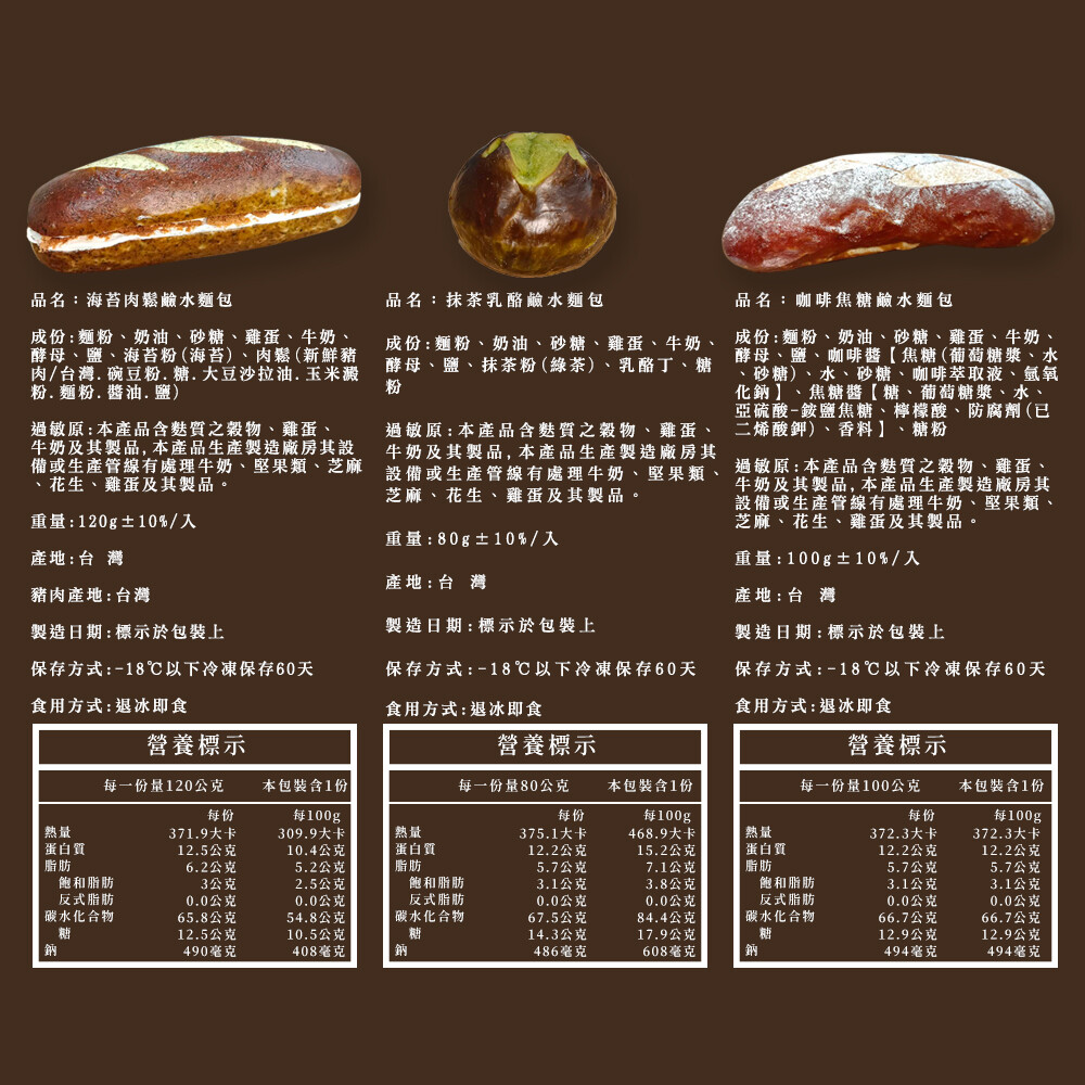 過敏原:本產品含麩質之穀物、雞蛋、牛奶及其製品,本產品生產製造廠房其設備或生產管線有處理牛奶、堅果類、芝麻、花生、雞蛋及其製品。