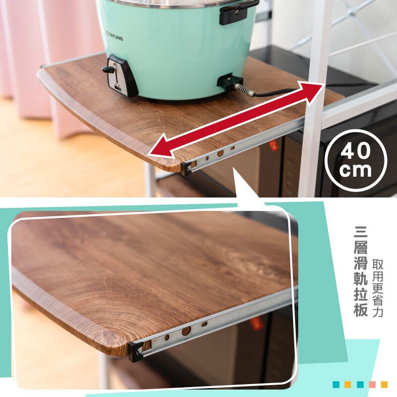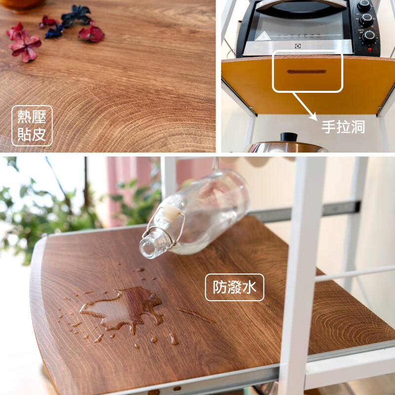 ▲有三層滑軌拉板,熱壓貼皮,防潑水