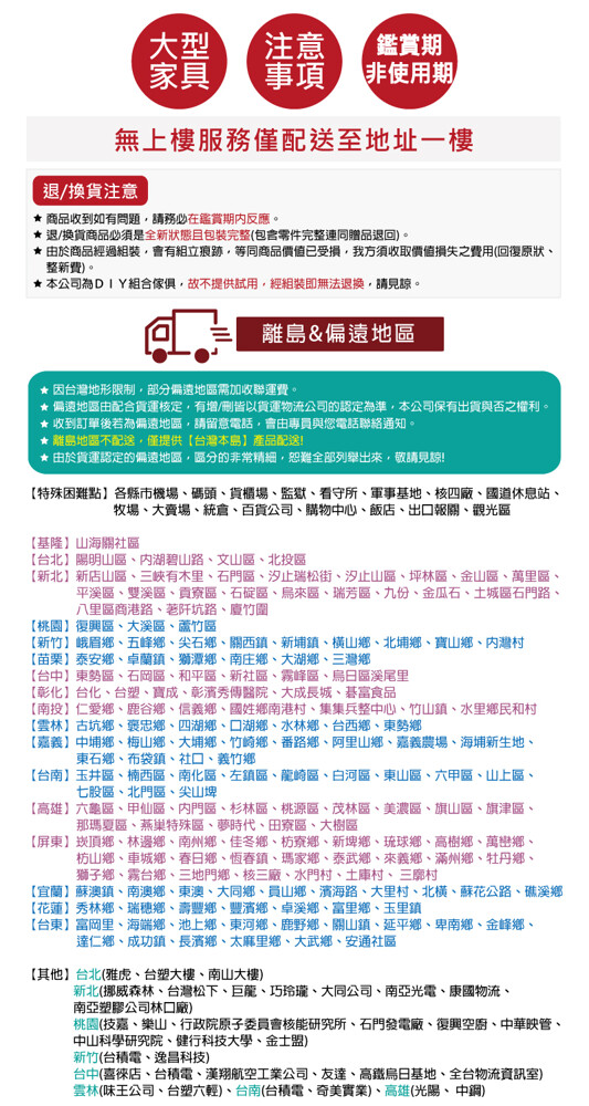 ■偏遠地區與離島需酌收運費,會有服務人員與您聯繫。