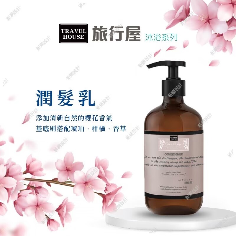 TRAVEL HOUSE 旅行屋 沐浴系列 以有機級提取物為特色 為客人帶來自然美好的體驗 為客人提供清爽頭髮和身體護理 潤髮乳 添加清新自然的櫻花香氣 基底則搭配琥珀、柑橘、香草 容量:500ml 保存期限:5年 製造日期"2023/06