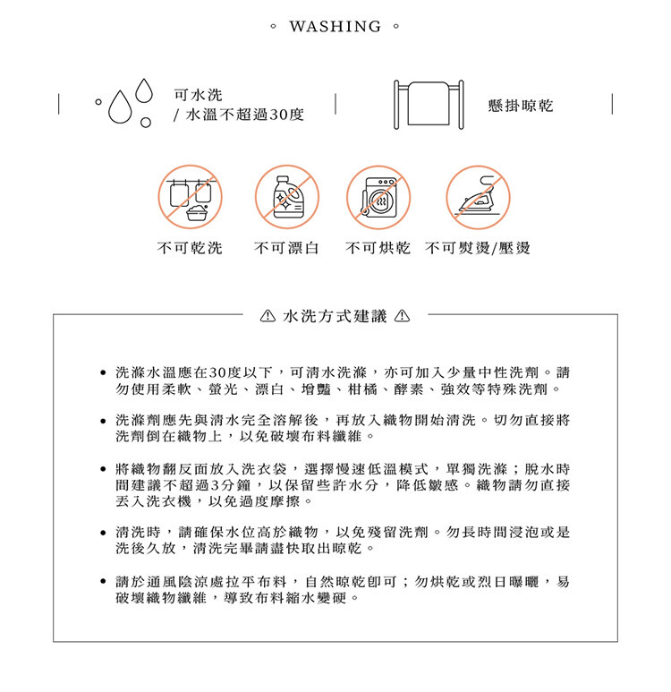 ◇清潔方式:可水洗(水溫不超過40度)╱不可乾洗╱不可烘乾╱不可漂白╱需隔布熨燙,且溫度低於150度