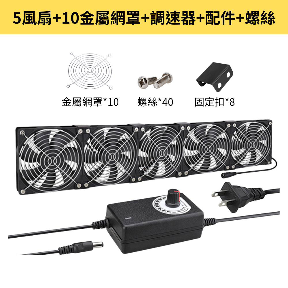 •內容物:12CM風扇*5+110V調速器+金屬網罩*10+螺絲*40+固定扣*8