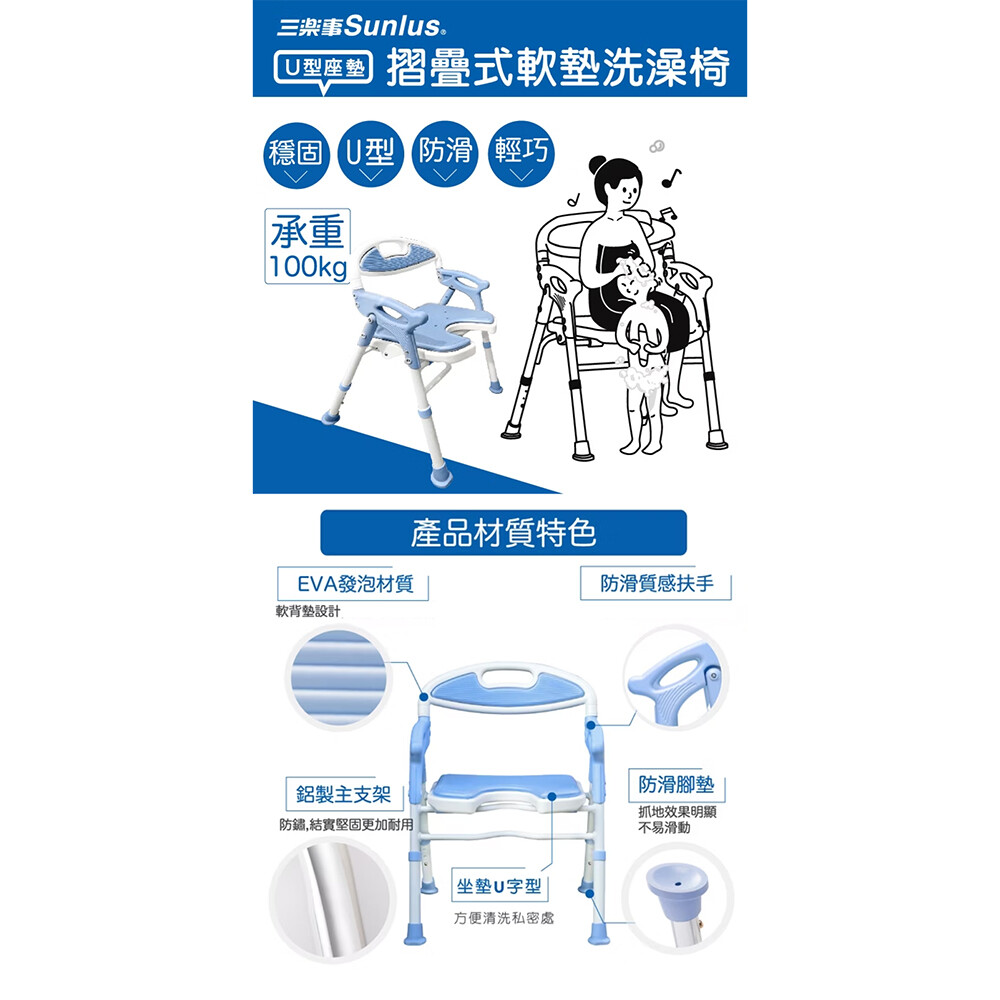 來而康 Sunlus 三樂事 摺疊式 軟墊 洗澡椅 U型款 SP5612 鋁合金 有背 浴椅 沐浴椅