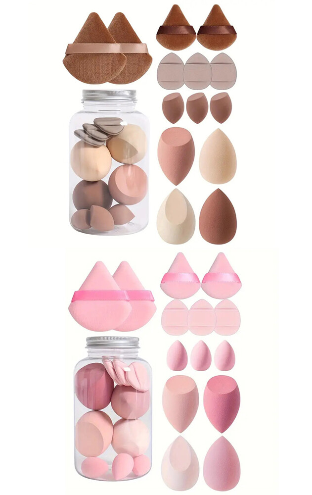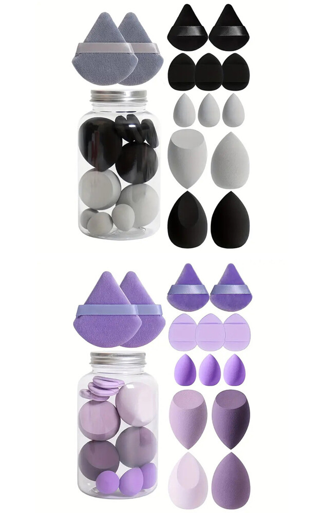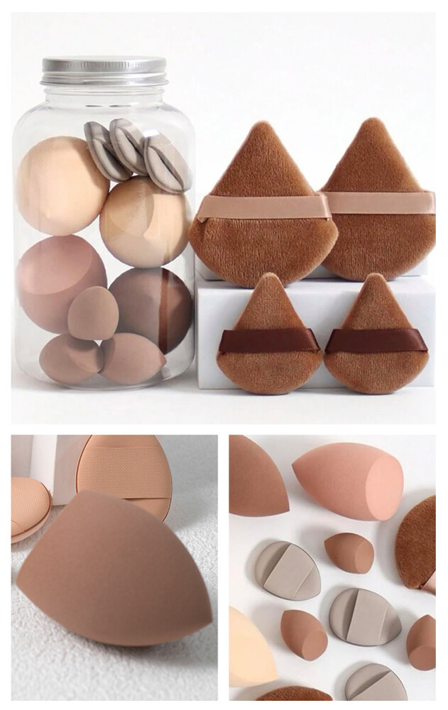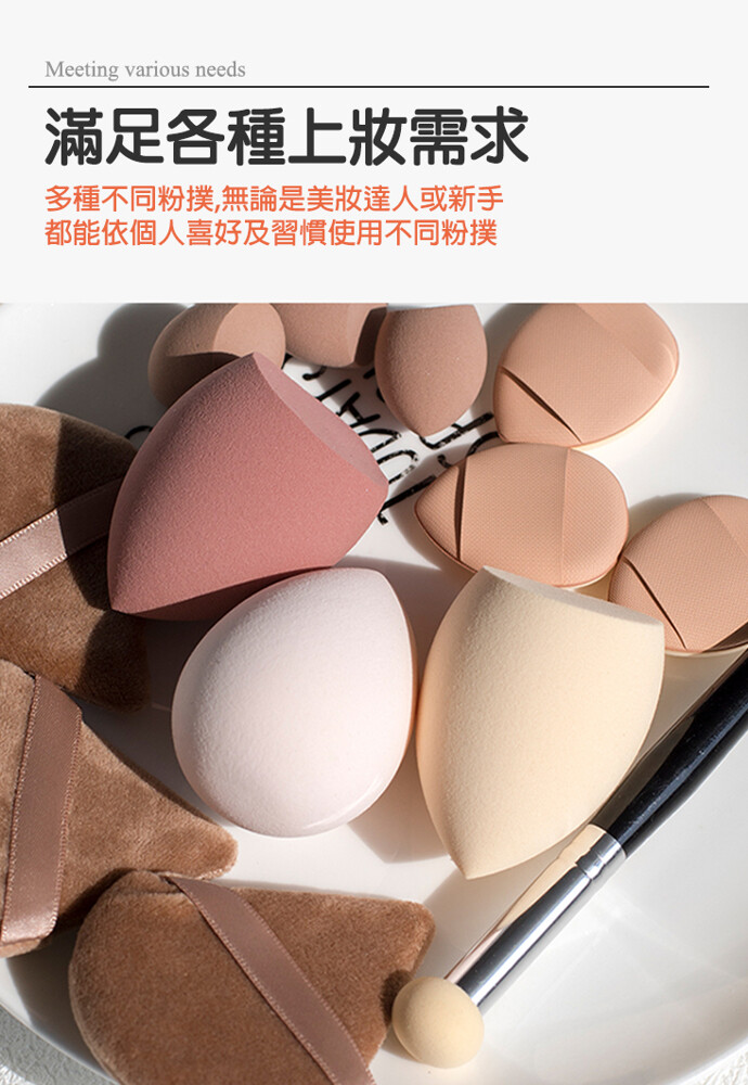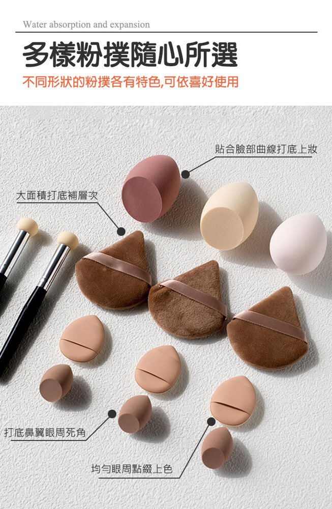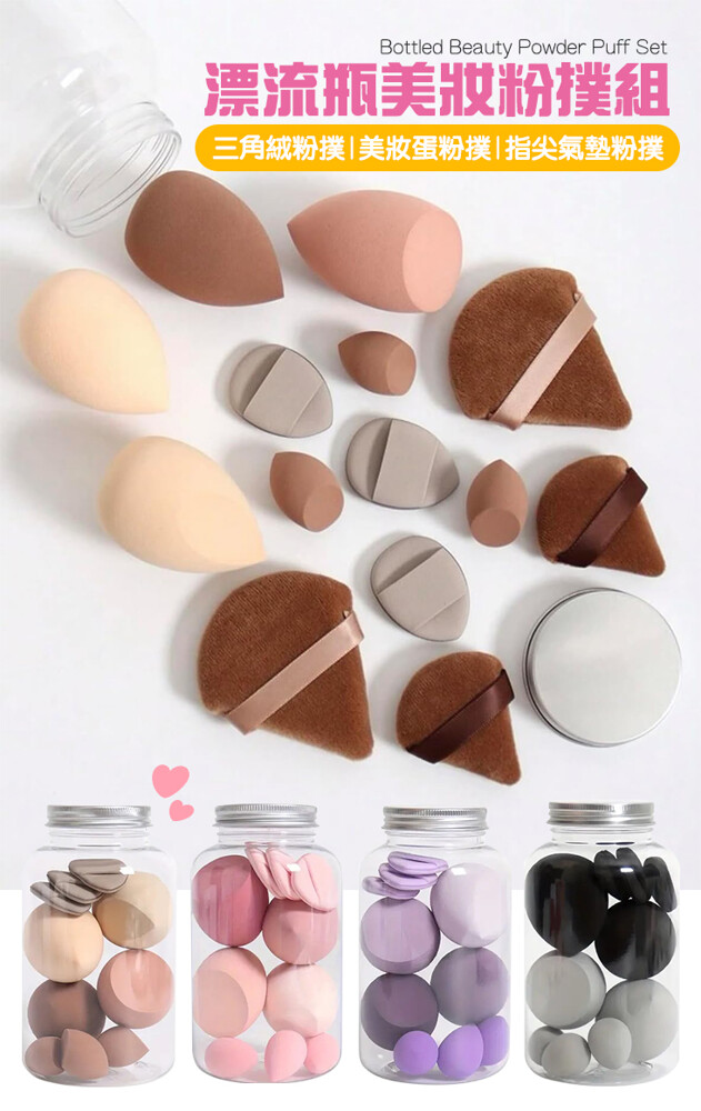內容物:14入瓶裝【三角絨粉撲(大)X2、三角絨粉撲(小)X2、指尖氣墊粉撲X3、美妝蛋粉撲(大)X4、美妝蛋粉撲(小)X3】
