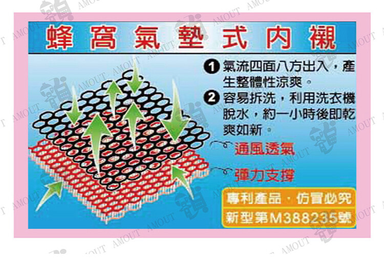 內襯採用多款氣墊式網布,增加配戴時的彈性感、舒適度與氣流效果。