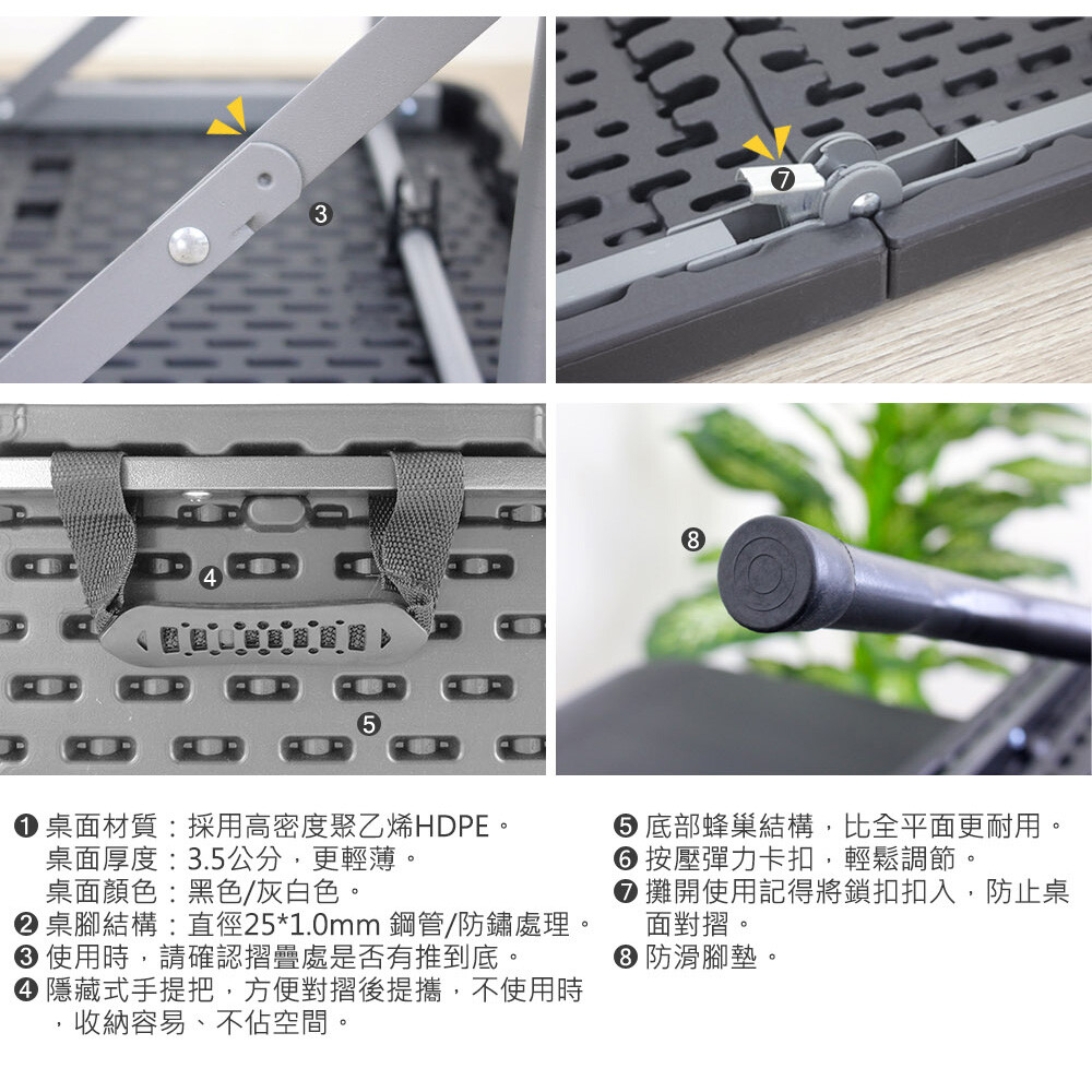 ◆桌面材質採用高密度聚乙烯HDPE(桌面厚度3.5公分)結構,耐磨、耐刮、耐熱,穩固耐用。
