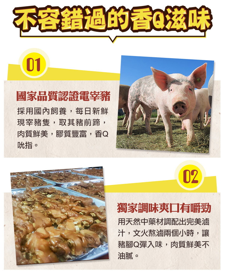產品成分:豬腳(台灣)、醬油、米酒(米、精緻食用酒精)、台糖特砂 、蒜末、油膏(水、非基因改造脫脂黃豆片胺基酸液、釀造生醬油(水、非基因改造脫脂黃豆片、小麥、食鹽)、轉化液糖(蔗糖、水)、粘稠劑(乙醯化己二酸二澱粉)、糯米、防腐劑(己二烯酸鉀)、甜味劑(甘草酸鈉)、酵母抽出物、食鹽、調味劑(DL-蘋果酸))、檸檬原汁、烏醋(水、釀造酢、糖、鹽、洋蔥、焦糖色素(第一類)、濃縮柳橙汁、蕃茄糊、胡蘿蔔濃縮汁、大茴、小茴、芹菜籽、香料)、八角、桂皮。