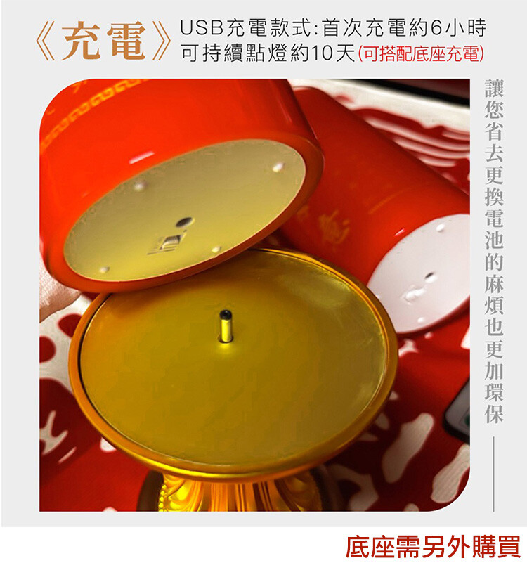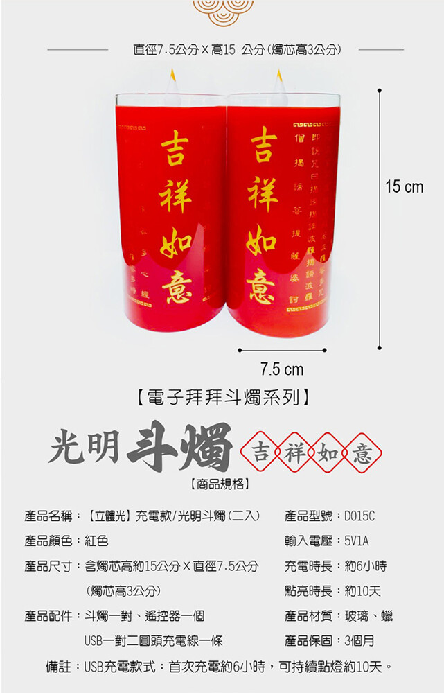 產品配件:斗燭一對、USB一對二圓頭充電線一條、遙控器一個。