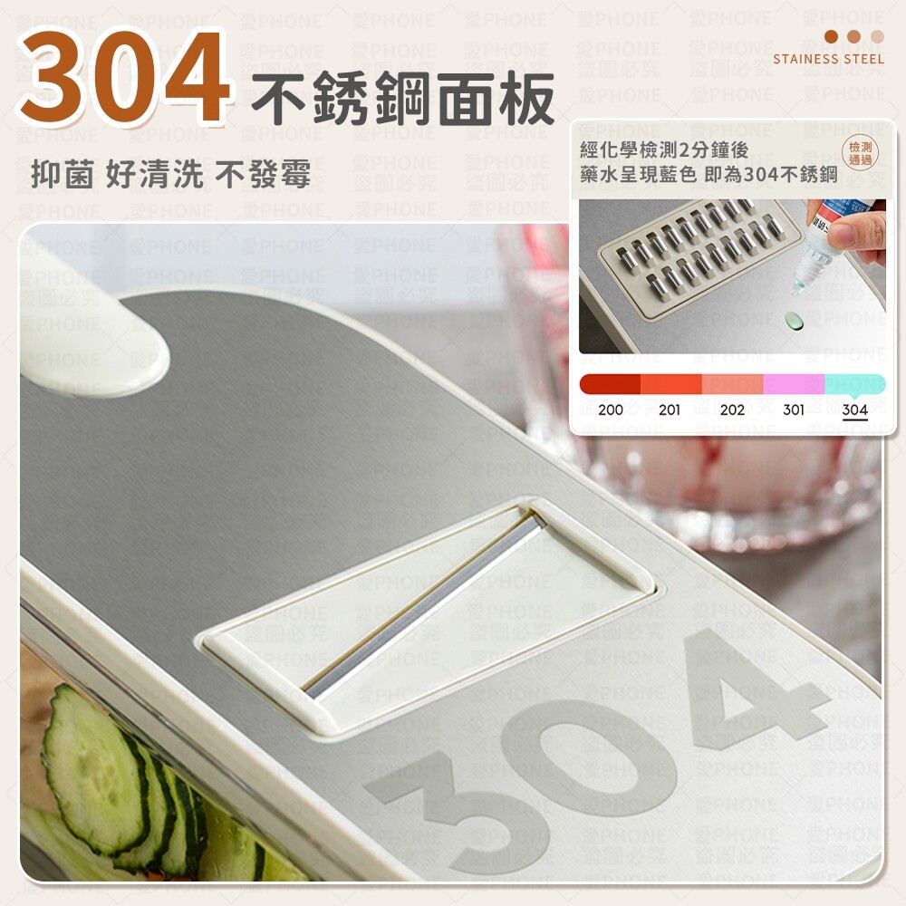 商品材質:切絲板-PET/304不銹鋼;把手鍵-PP;防滑墊-TPR;瀝水藍-PET