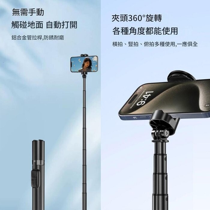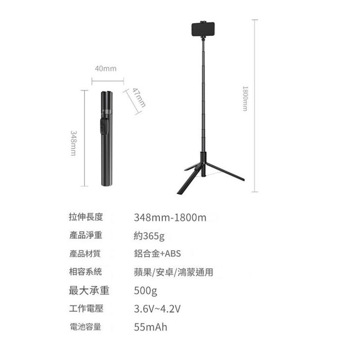 規格: 黑色 產品名稱:X96丟丟桿 伸長長度:348毫米-1800毫米 產品淨重:約365g 產品材質:鋁合金+ABS 相容系統:蘋果/安卓/鴻蒙通用 最大承重:500克 工作電壓:3.6V~4.2V 電池容量:55毫安培時