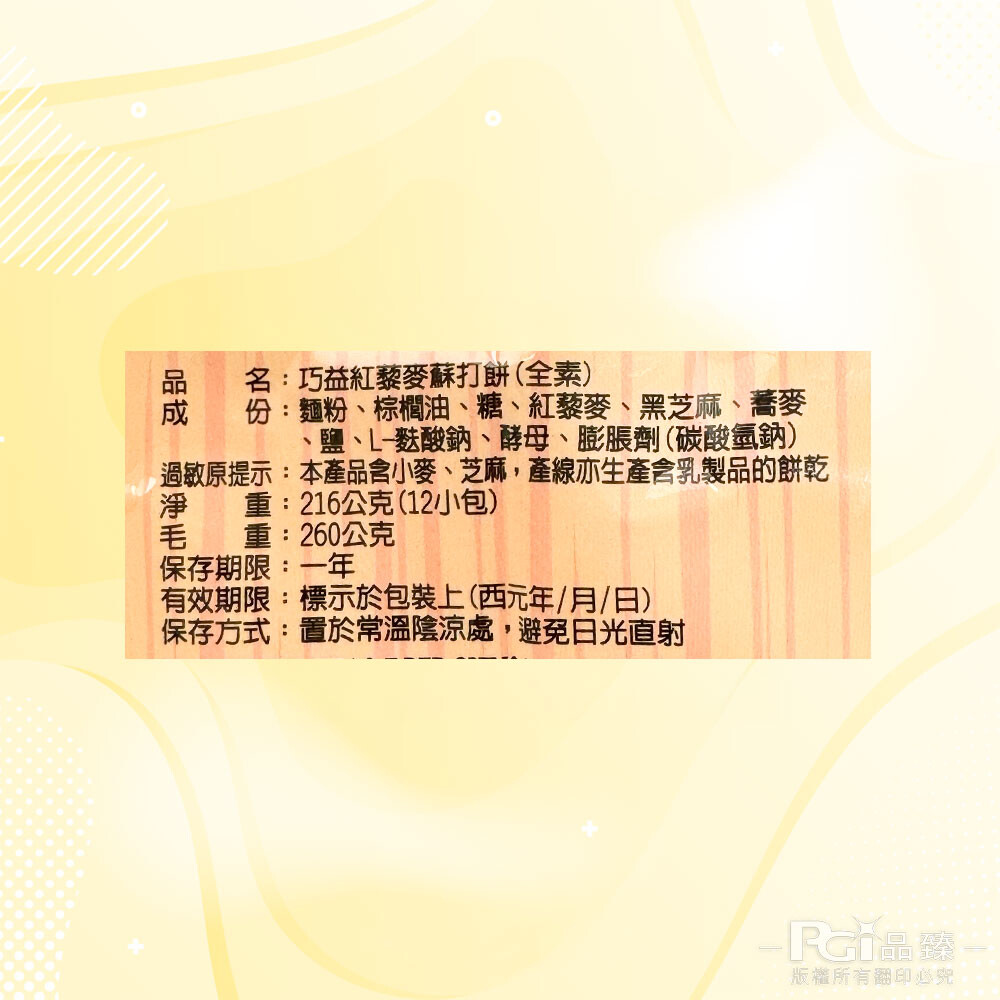 1.商品品名:【巧益】紅藜麥蘇打餅(全素)(216g)