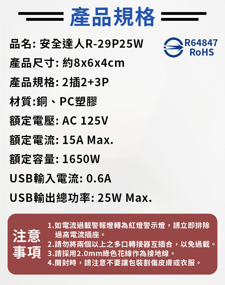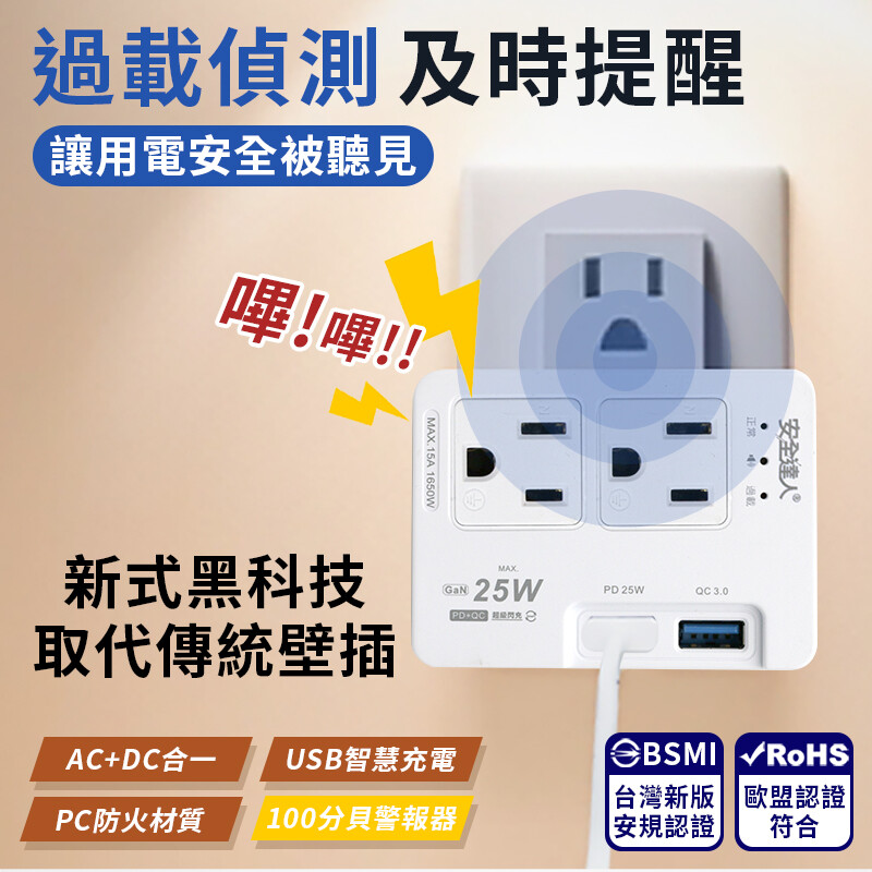 本產品僅提供電流過載警報及警示,無法自動斷電保護,且無法保護因瞬間短路造成的異常狀態,請使用時特別注意所使用的負載端電器產品是否有異常狀態。