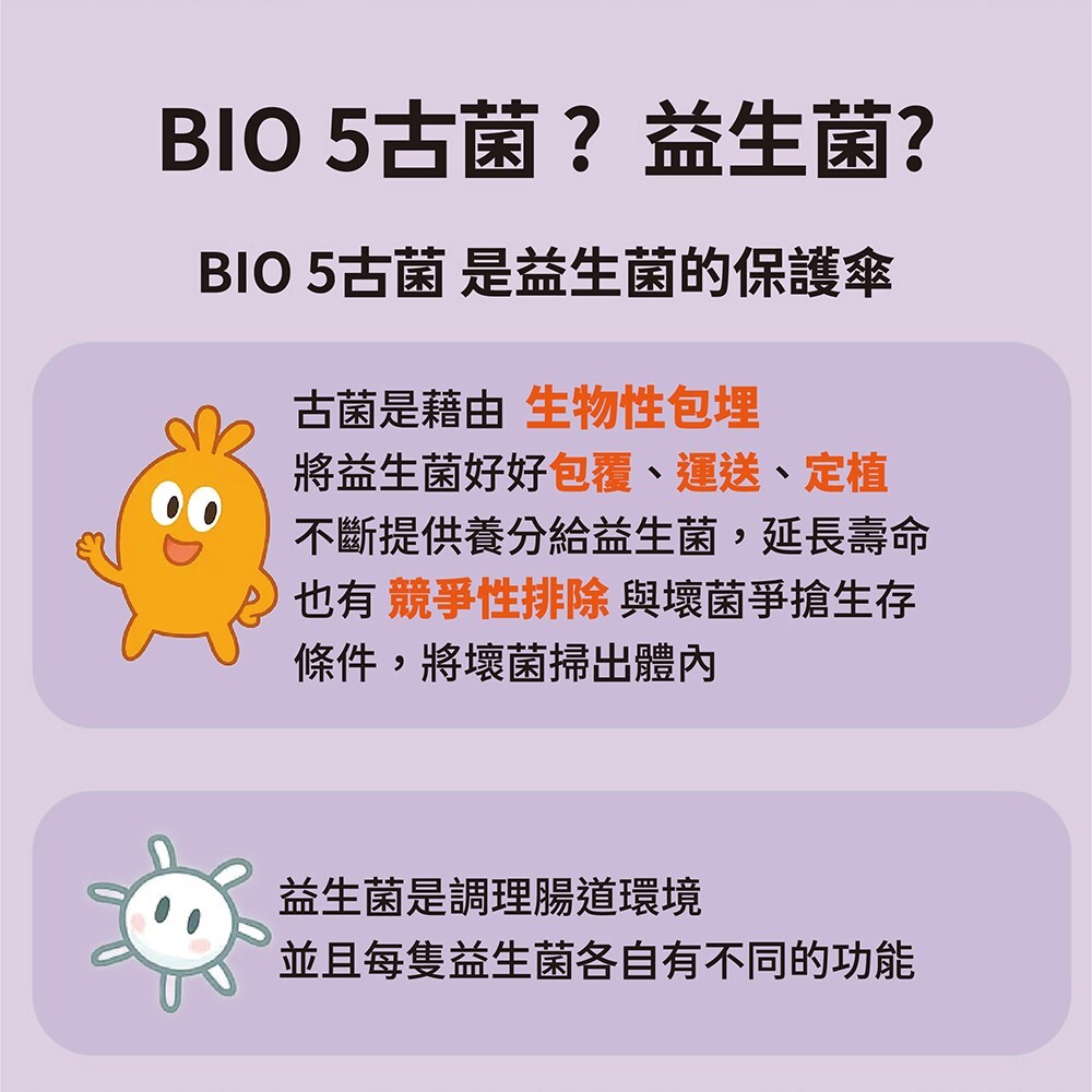 🔸專利美國原料Bio5古菌,保護益生菌,將壞菌掃出,打造腸道好菌叢