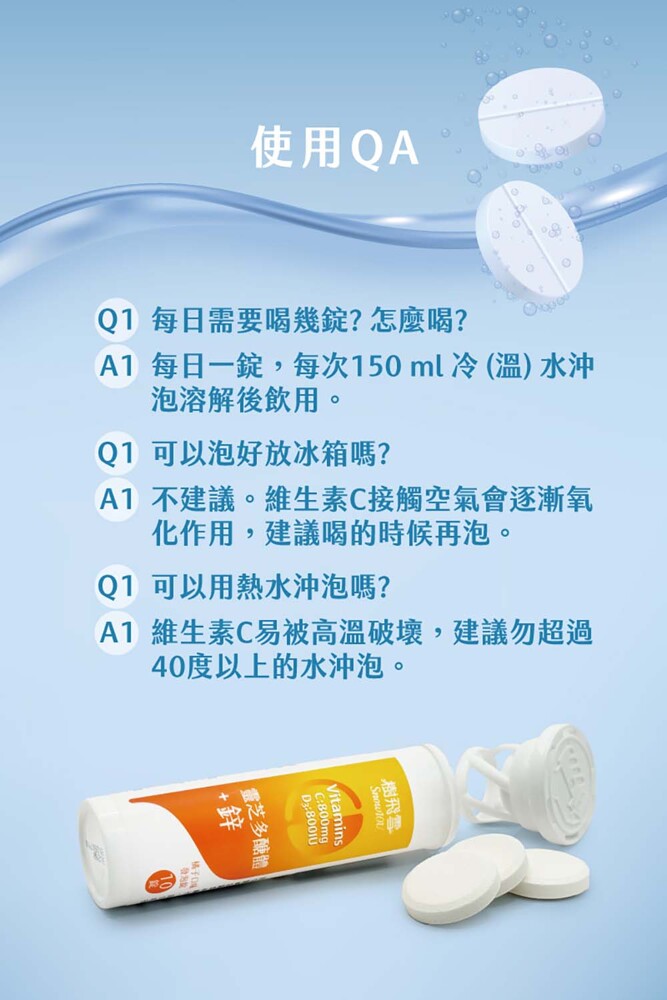 ■ 成分:抗壞血酸(維生素C)、D-山梨醇、碳酸氫鈉、多醣體萃取物【靈芝菌絲體發酵液(Ganoderma lucidum,液態培養)、難消化性麥芽糊精】、檸檬酸、酒石酸、聚乙二醇、橘子粉末香料【麥芽糊精、香料、維生素E(抗氧化劑)】、硫酸鋅、醋磺內酯鉀(甜味劑)、蔗糖素(甜味劑) 、維生素D3【修飾澱粉(辛烯基丁二酸鈉澱粉)、蔗糖、維生素C(抗氧化劑)、中鏈三酸甘油酯、二氧化矽、維生素E(抗氧化劑)、維生素D3】