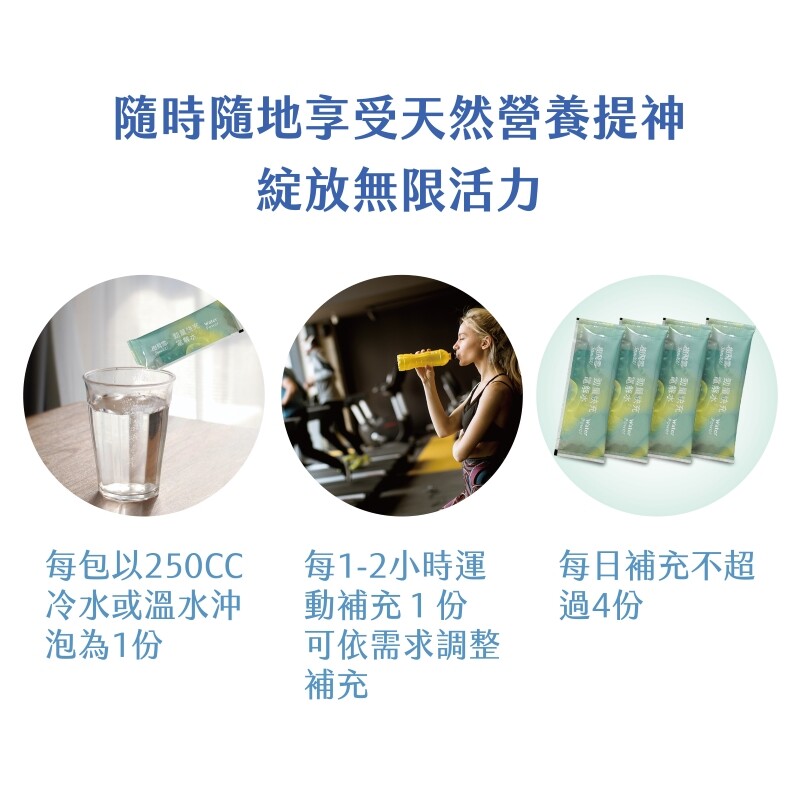 ■食用方式:每包以250CC冷水或溫水沖泡為1份每1-2小時運動補充1份,可依需求調整補充,每日補充不超過4份