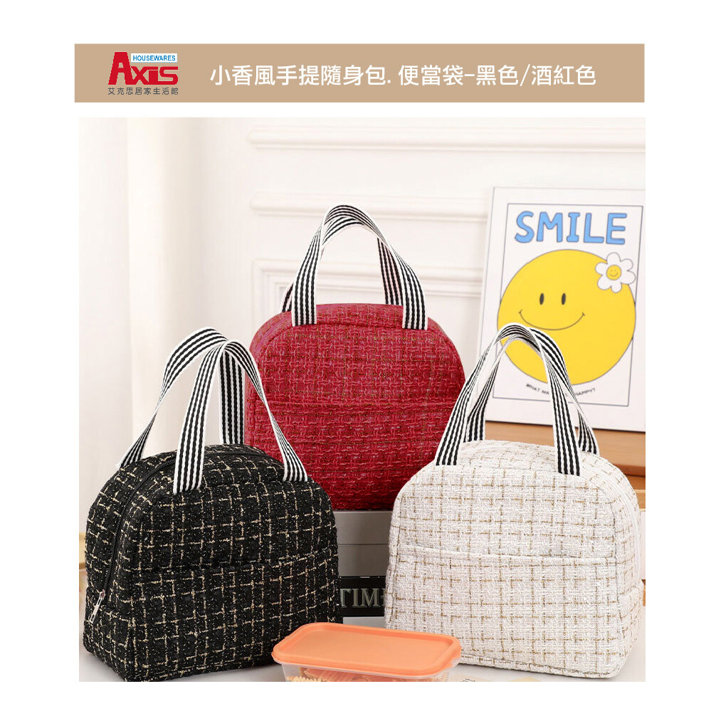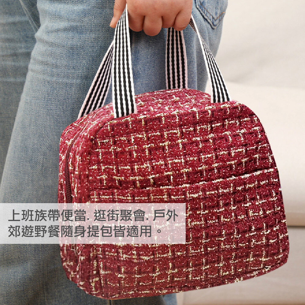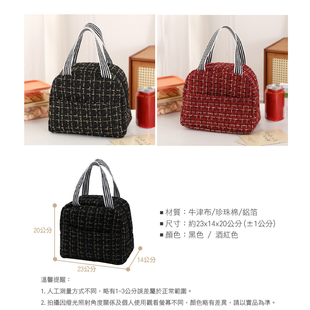 【商品特色】 前側口袋,貼心設計 寬版提袋,舒適不扎手 編織面料質感提升 上班、聚會、隨身包皆適用 【商品規格】 材質:牛津布 / 珍珠棉 / 鋁箔 尺寸:23X14X20公分 (±1公分) 款式:黑色 / 酒紅色 數量:1入/2入 產地:中國